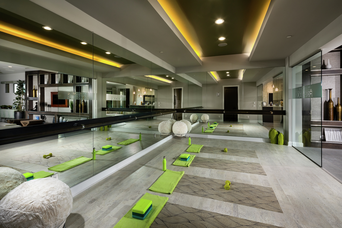 - A serene yoga or meditation studio that features large tropical plants and dimmable lighting