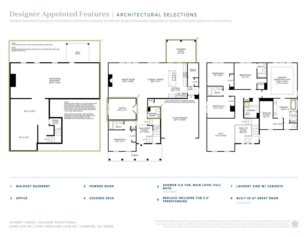 Stylish contemporary living. The Hillside's inviting covered porch and stunning two-story foyer open onto a bright flex room, spacious great room, and casual dining area with rear yard access. The well-designed gourmet kitchen is complete with a large center island with breakfast bar, plenty of counter and cabinet space, and huge walk-in pantry. The serene primary bedroom suite is enhanced by a lovely tray ceiling, gigantic walk-in closet, and deluxe primary bath with dual-sink vanity, large soaking tub, luxe shower with seat, and private water closet. Central to a generous loft, the sizable secondary bedrooms feature ample closets, one with private bath, two with shared hall bath. Additional highlights include a desirable first floor bedroom suite with closet and shared full hall bath, convenient everyday entry, centrally located laundry, and additional storage.