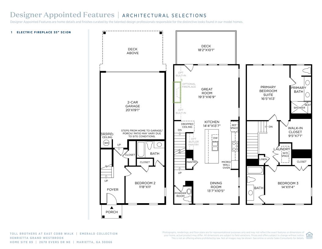 The Henrietta Grand features an open floor plan that blends luxury with style. Step inside the cozy foyer with stairs that lead up to the main living level. A beautiful great room seamlessly connects to the kitchen and a covered deck, creating an ideal environment for relaxing and entertaining. The kitchen is well-appointed, overlooking a cozy dining room and enhanced by a spacious center island that provides additional prep space and casual seating. The primary suite is tucked away on the third level, complete with an expansive walk-in closet and a luxurious private bath featuring dual sinks and a large shower with seat. Two secondary bedrooms, one on the third floor and one on the first floor, offer private baths and enhanced comfort for family or guests. Additional highlights include bedroom-level laundry, a convenient powder room on the main living level, and plenty of storage throughout.