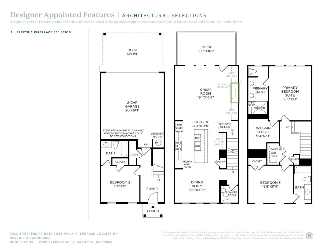 The Henrietta epitomizes modern luxury living with its stylish, three-story floor plan. An inviting foyer leads you up to the main living space, where you are greeted by the heart of the home, the spacious great room and an expertly designed kitchen. Connecting to a cozy dining room, the kitchen is enhanced by a large center island, ideal for casual entertaining. Upstairs, the primary bedroom suite offers a tranquil escape with an expansive walk-in closet and a spa-like private bath offering dual sinks and a luxurious shower. Two secondary bedrooms are strategically placed, one on the third floor and one on the first level, each offering a private bath. A beautiful deck is accessible from the great room, offering exceptional opportunities for outdoor living. Also featured in the home is bedroom-level laundry, a powder room, and plenty of added storage.