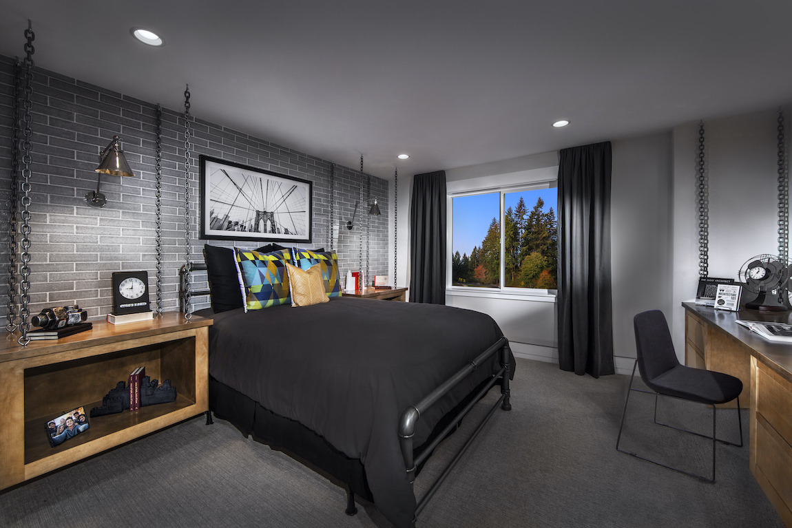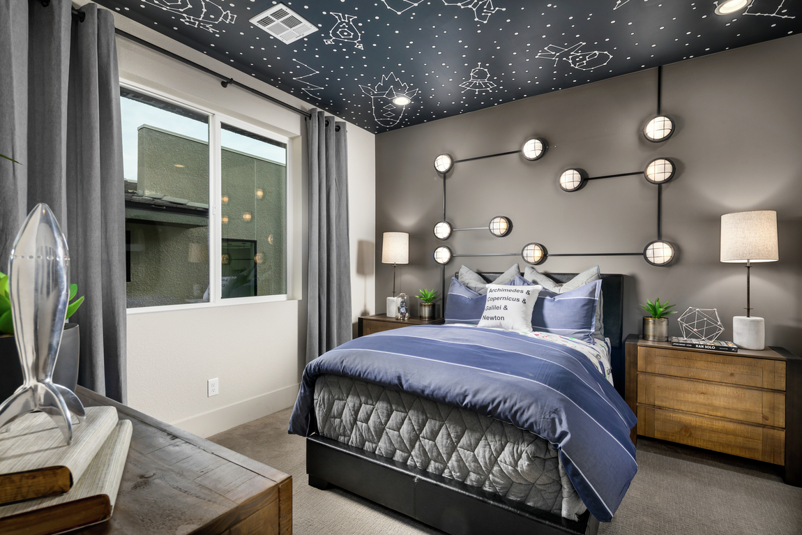 Elevate a room through the use of non-traditional materials. Aluminum panels, reminiscent of those used to build airplanes, have been incorporated as an accent wall to take this themed room to new heights.