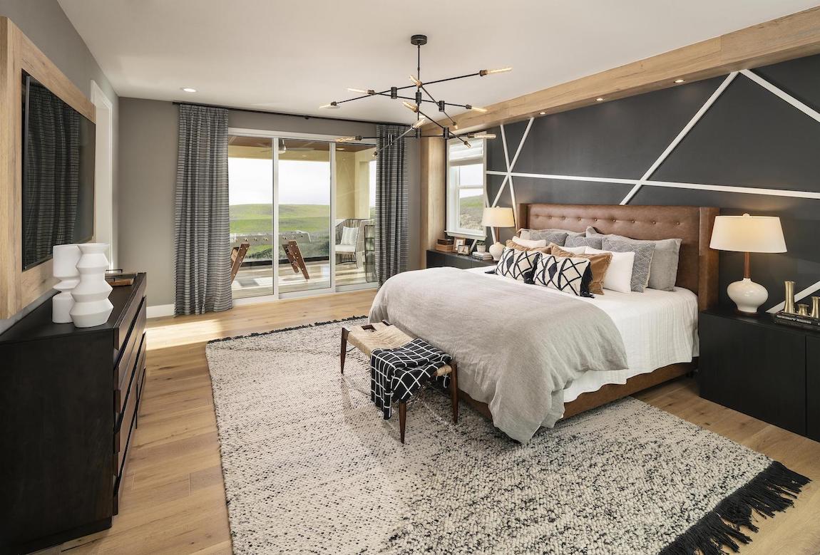 A bold yet simple graphic design on this headboard wall acts as art while contributing balance to the overall composition of the room.