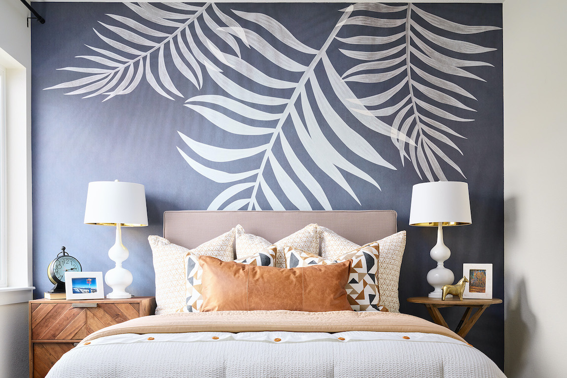 A large-scale organic botanical print makes a bold statement in this bedroom. With its natural silhouette, layering soft, neutral finishes throughout the rest of the room lets the accent wall shine.
