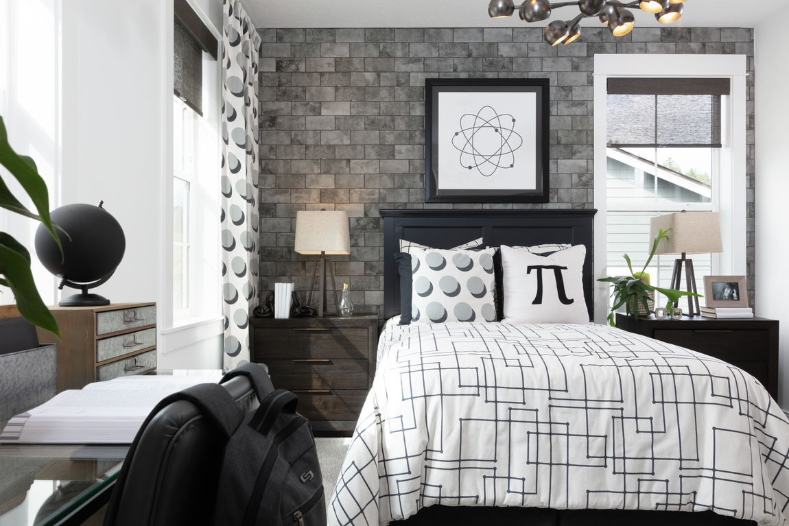 This ceramic wall tile beautifully mimics a concrete brick. The clean lines and change in texture are the perfect complement to this industrial-style bedroom.