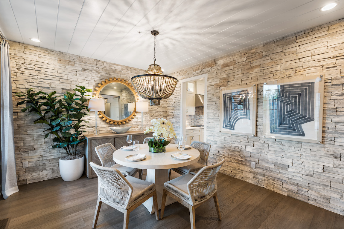 Stone provides a stately feel that is at once both strong and subtle. Whether light and bright or dark and dramatic, it enhances the design without having to adjust the layout of the room. Stone is a great material from indoor and outdoor kitchens, or bold entryways, stone accent walls make a bold statement.