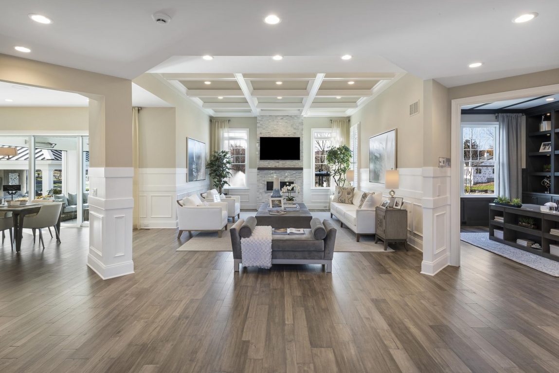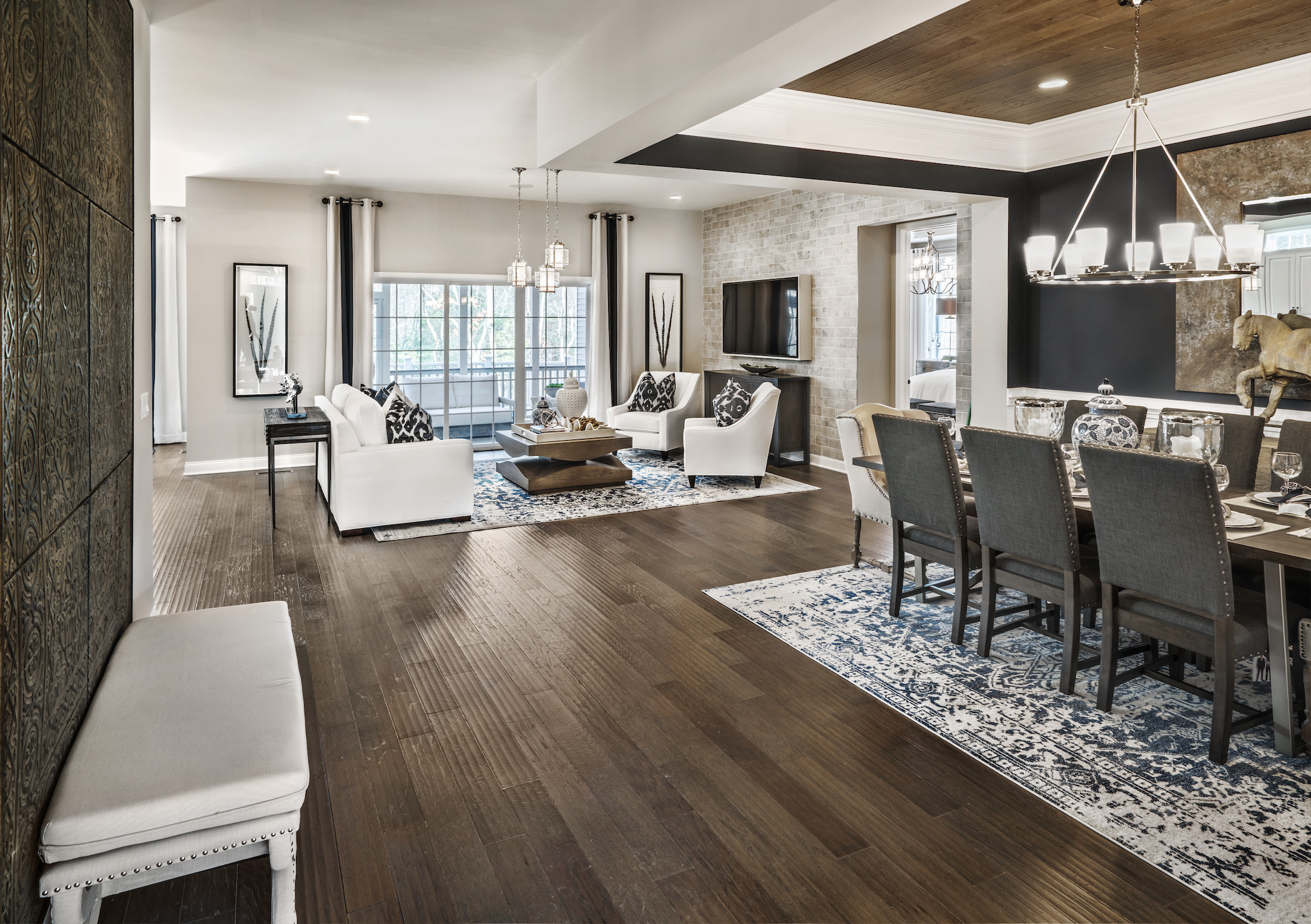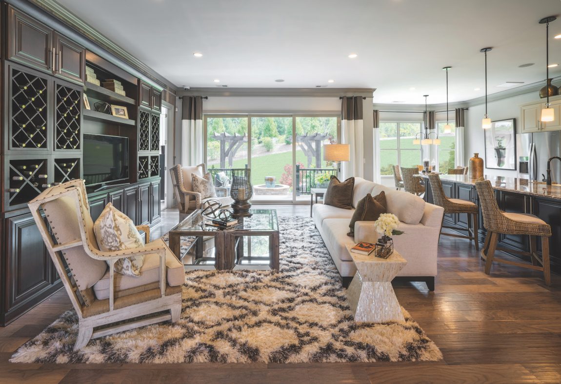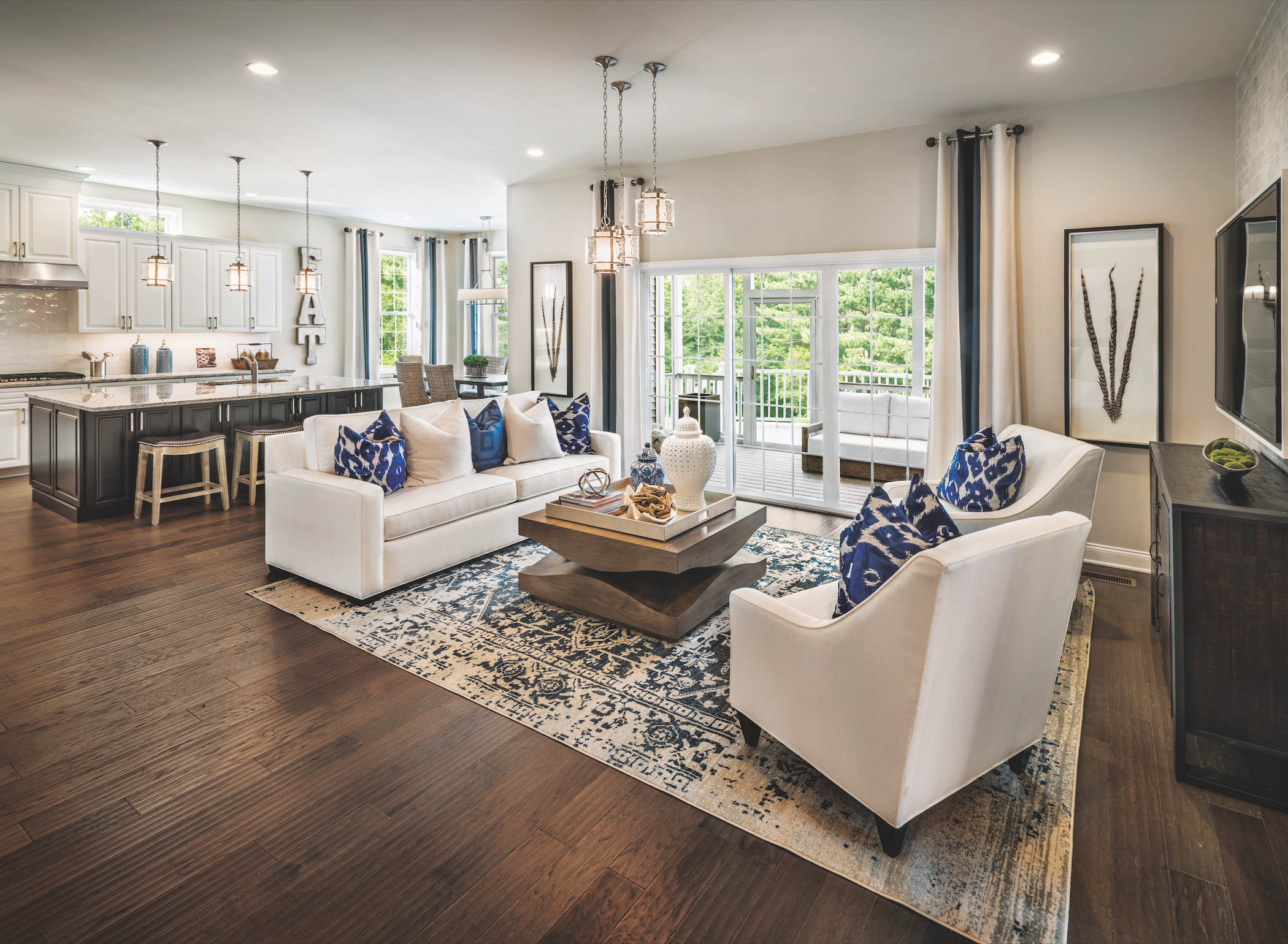 The Dandridge model home in Pennsylvania features a luxurious open-concept family room fit for the entertainer. A sophisticated finished basement equipped with all of the necessities offers even more space for gatherings and get-togethers.