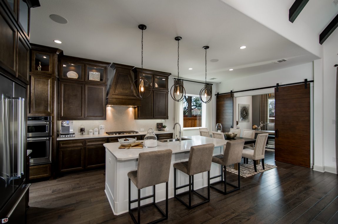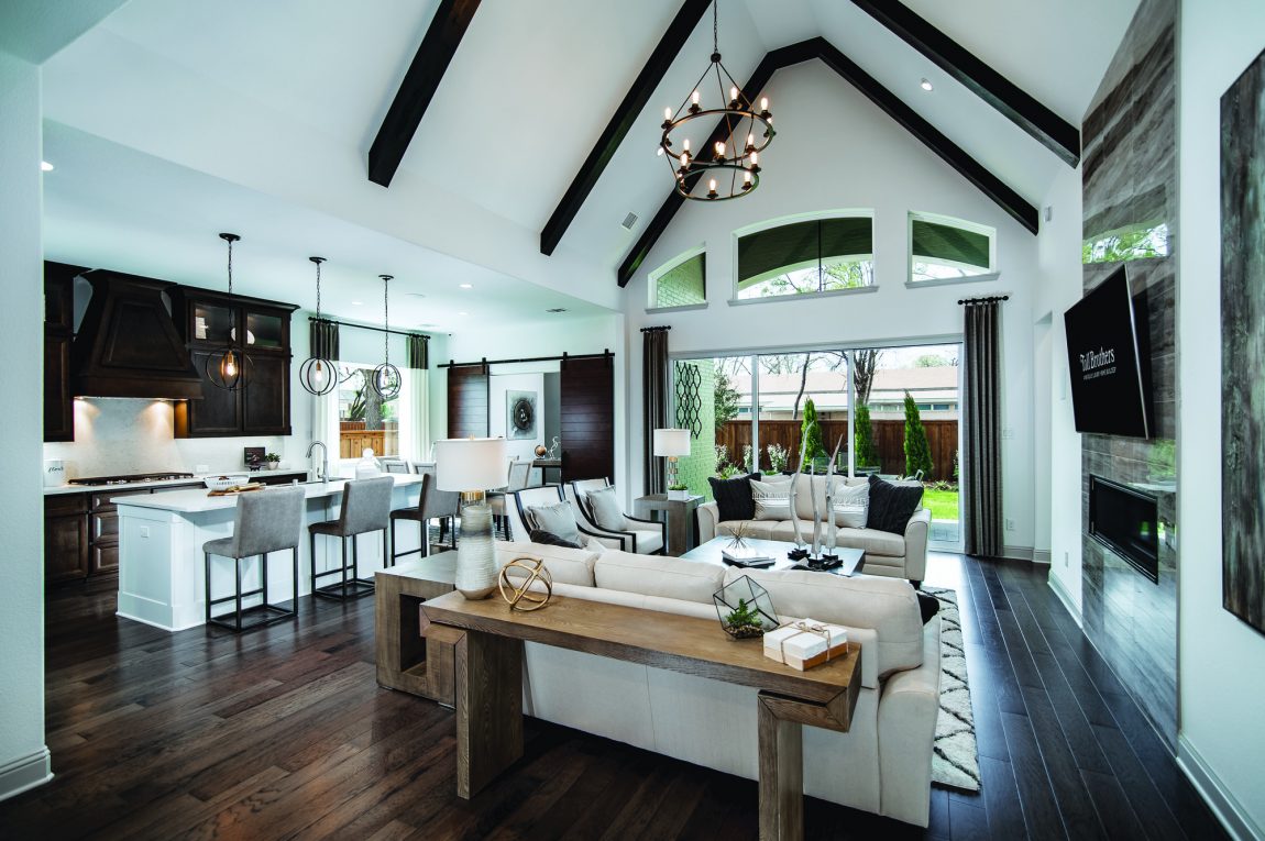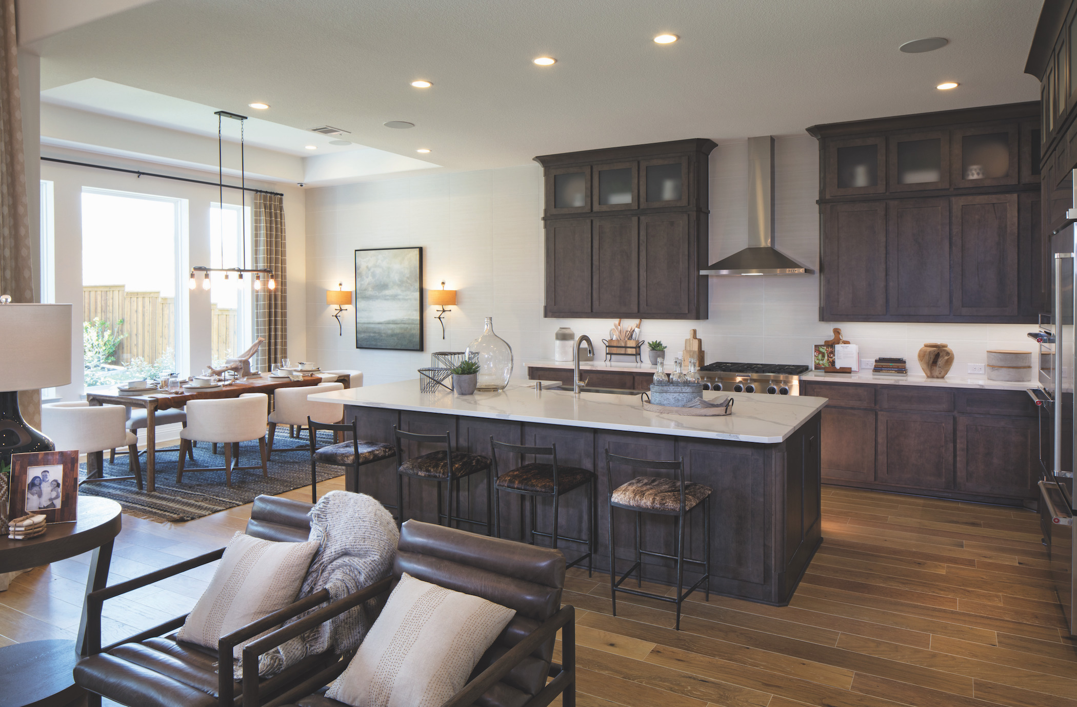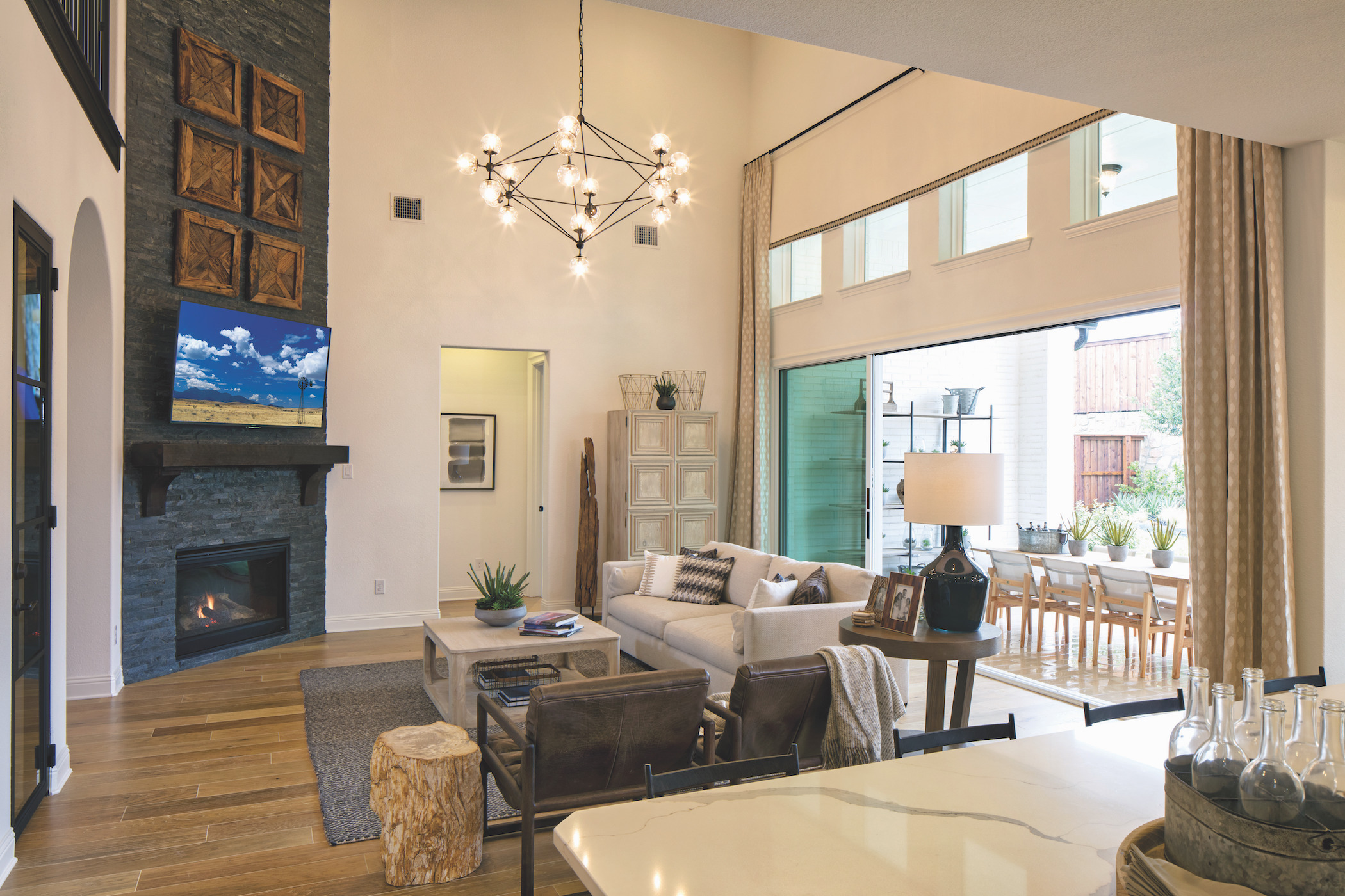 The Longview model home in Texas features a grand fireplace that offers a cozy ambiance for chillier days and nights. The dining area and outdoor spaces combined with an open-concept kitchen create the perfect setting for get-togethers and gatherings.
