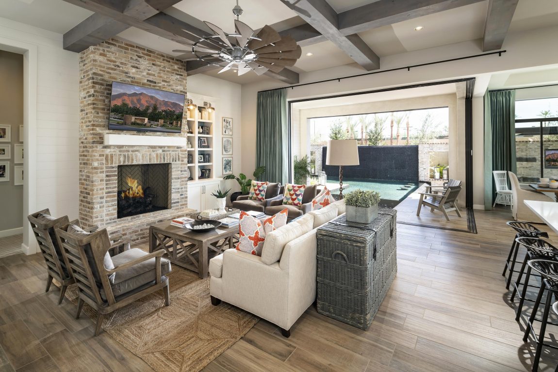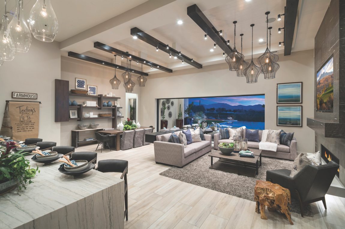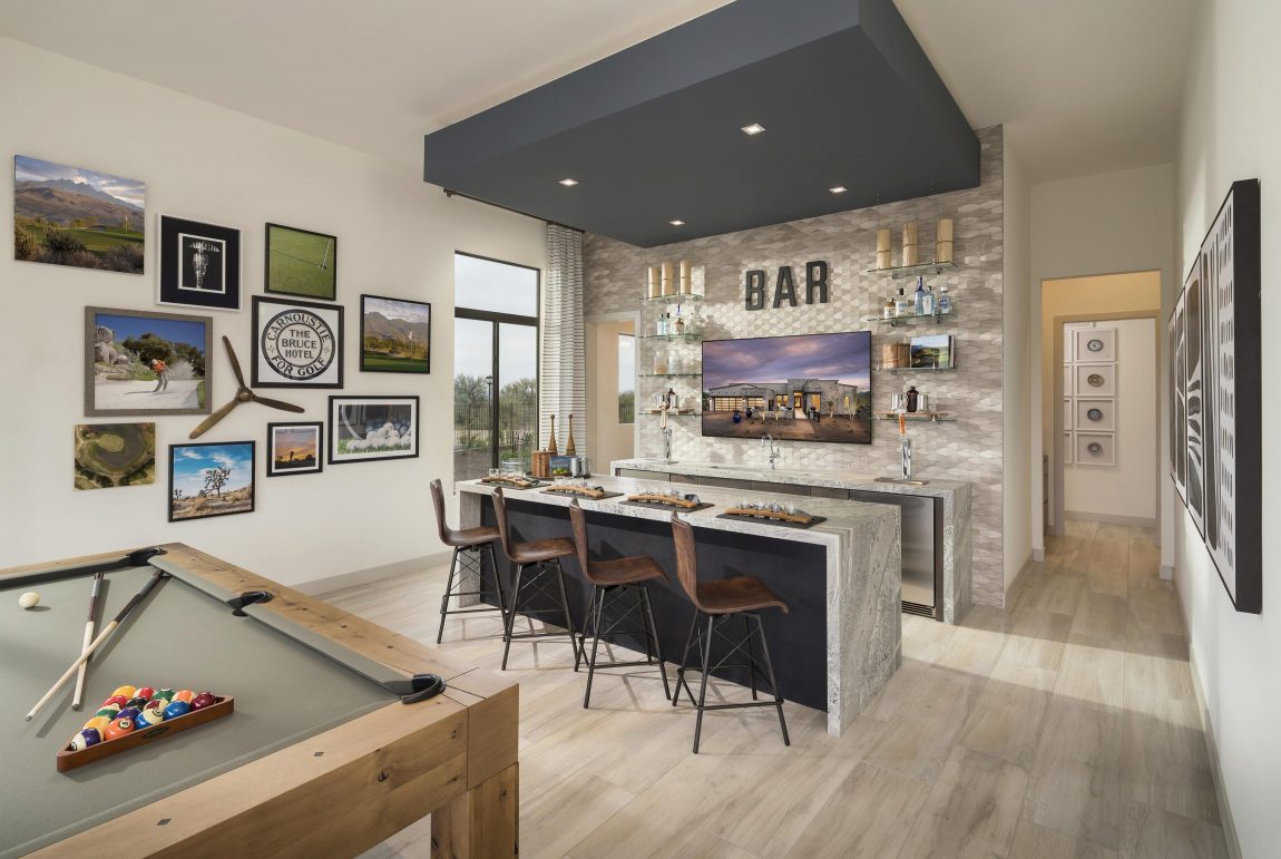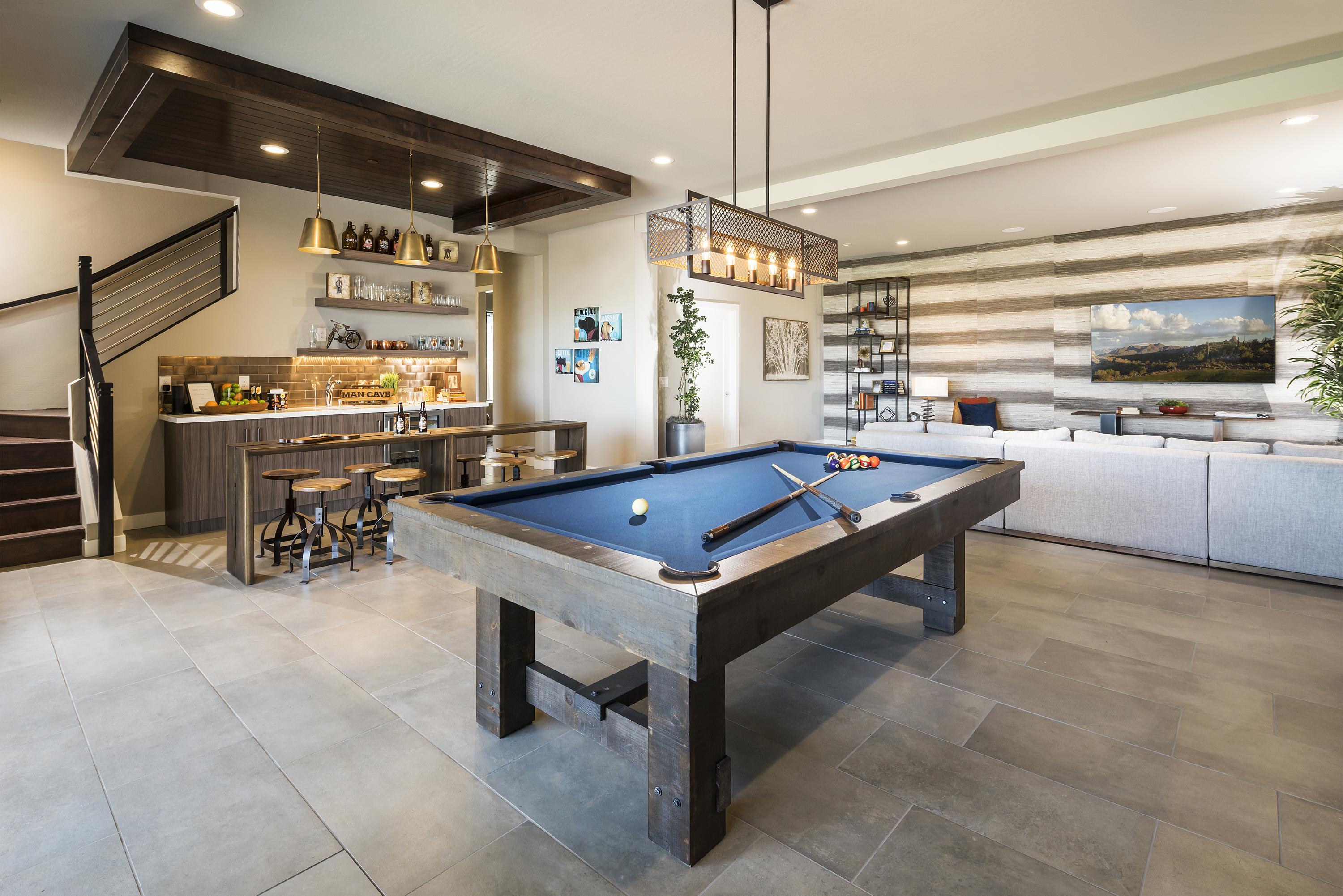 The Rushmore model home in Arizona highlights a contemporary great room with appealing earth tones and wooden accents. Host a grand party in this open-concept space, or enjoy a low-key game of billiards with friends and relatives in the impressively finished basement.