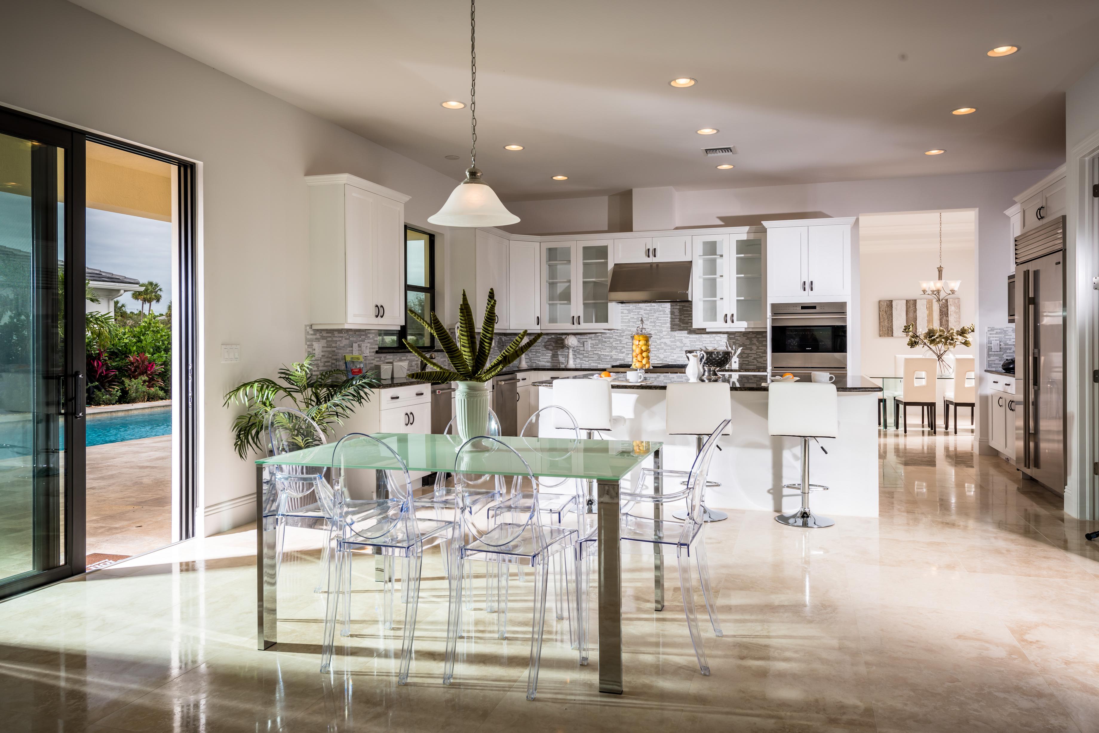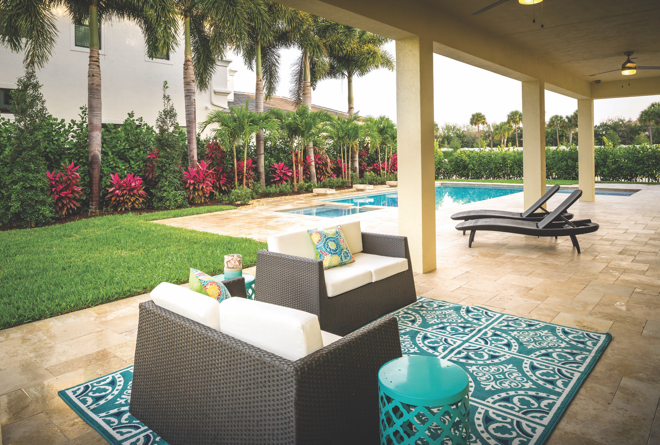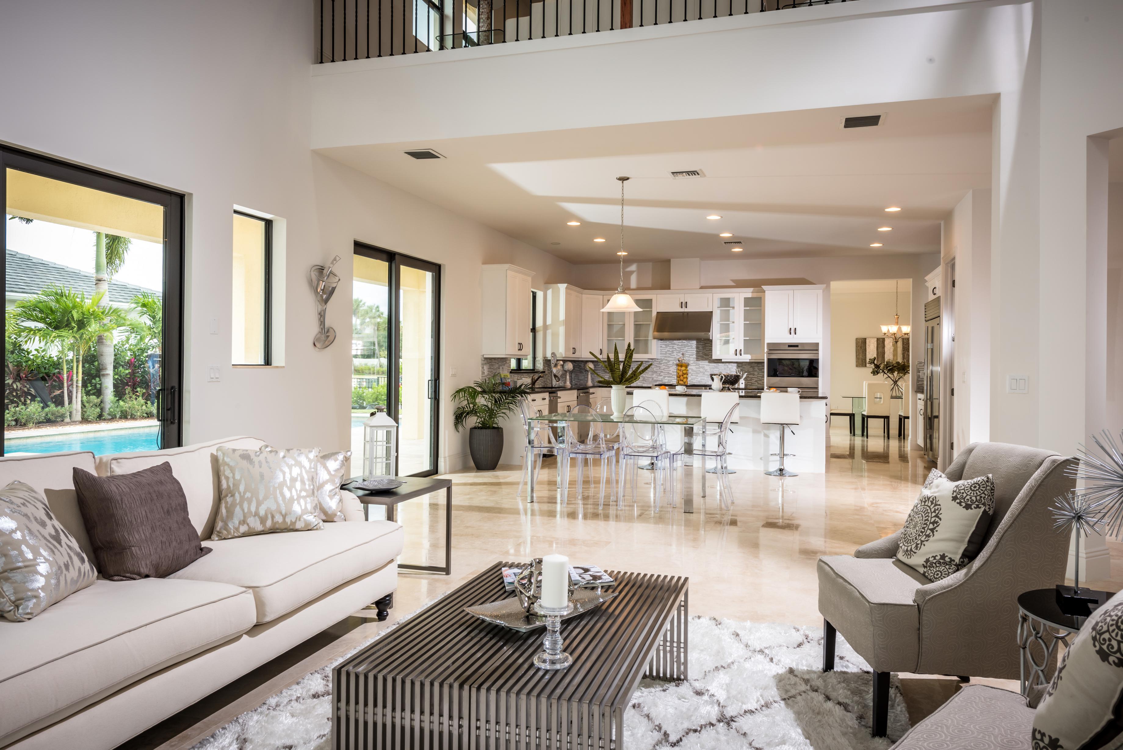 Glass elements and pops of color add to the elegance of the Carena home design at the Royal Palm Polo Club in Florida. Entertain family and friends in this open, inviting space, and host a get-together in the beautiful backyard.