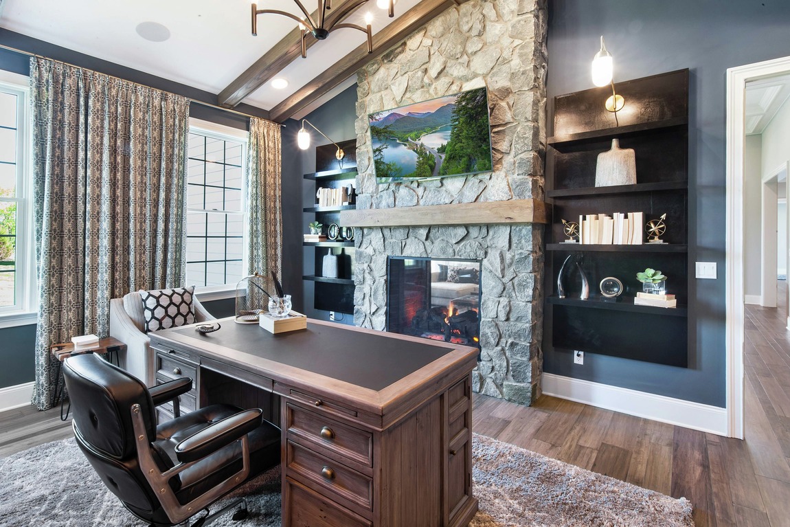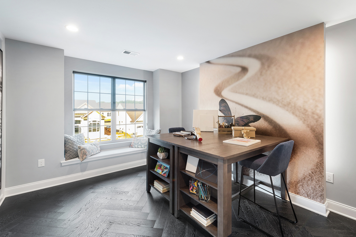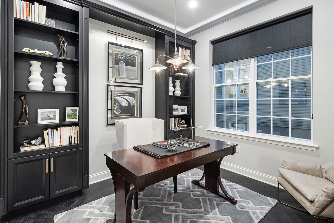 - The versatile first floor includes not only a private office that can double as a bedroom, but also the primary bedroom with a large walk-in closet and a primary bath with dual-sink vanity.