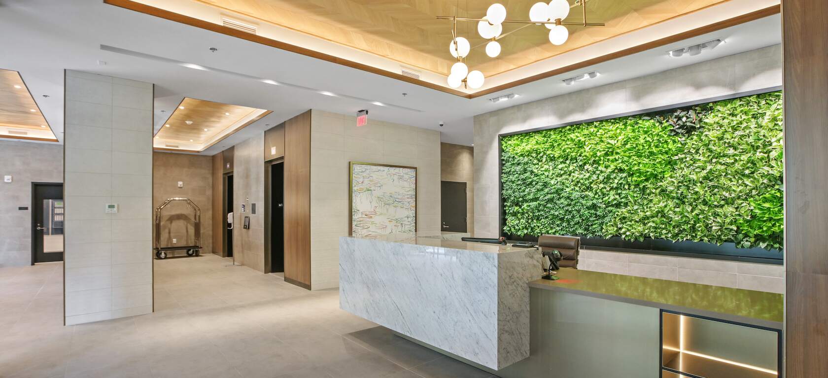Such a striking design demanded an edgy, unexpected choice of art in the lobby entrance. Santangelo and the Toll Brothers team worked with artist Graham Caldwell, commissioning a hanging mirrored sculpture that complements the building’s architecture and futuristic aesthetic.