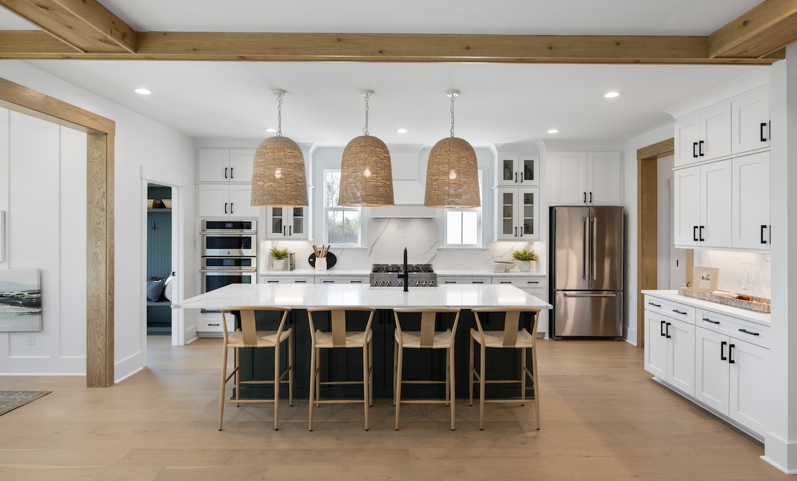 This stunning kitchen incorporates a layered white palette, black accents, and stylish pendant lighting to create a unique transitional style that feels modern and timeless.