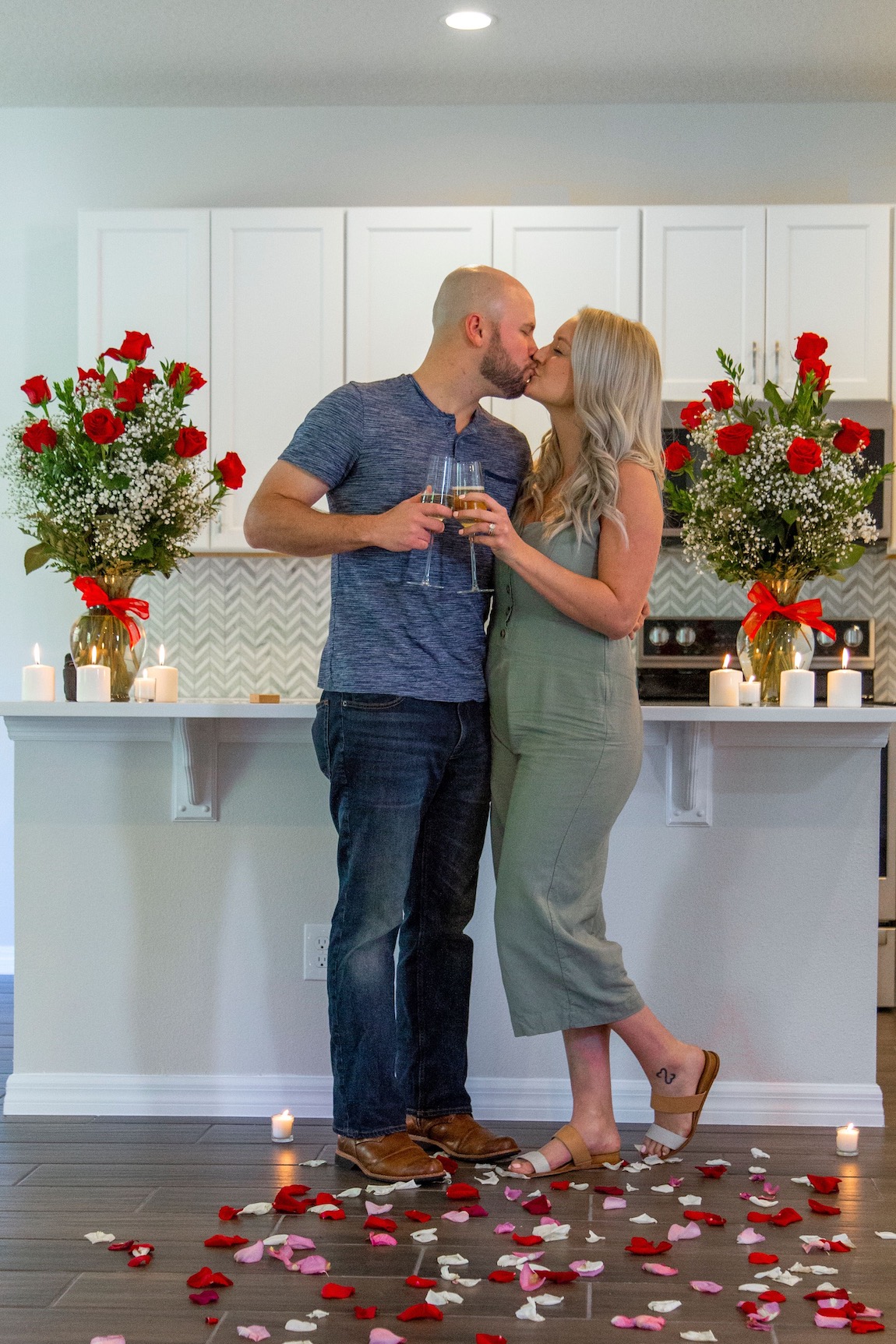 In that moment, I walked into our greatest adventure yet. I was led to Justin by a trail of rose petals. As we stood in our new house, hand in hand, Justin asked me to spend the rest of my life with him (and the dogs). With zero hesitation, I nodded yes and eventually, through tears, the word, “yes” made it out. We celebrated in our new home surrounded by the amazing Toll Brothers team and called all our friends and family to share the news. After emptying our PODS and U-Haul, we celebrated with champagne—alongside moving boxes—with our families.