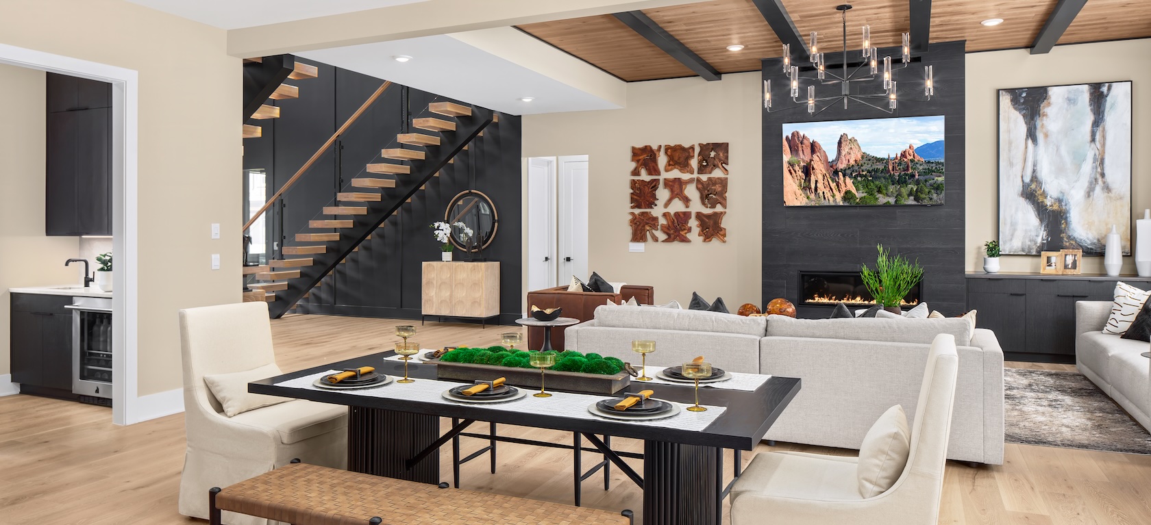 Interior design experts are inspired by exterior architecture and pull the outside in, from matte black mullions, roofing, and siding to interior modern light fixtures in hallways, sleek trim around photographs, or fireplace surrounds, to create a breath of elegance. Home offices, mudrooms, and flex spaces are also among the top areas to incorporate this refined element.