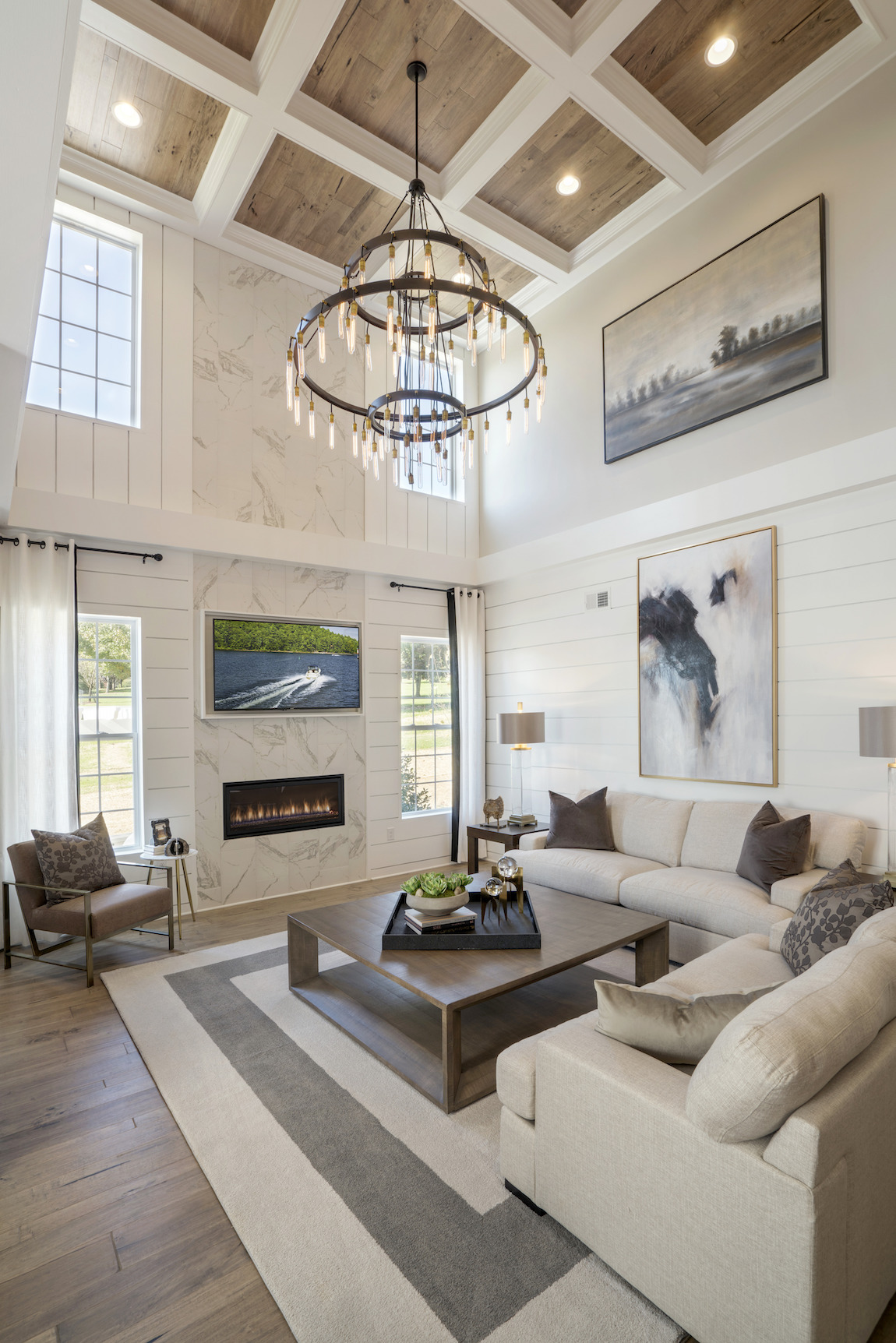 The Regency at South Whitehall’s Berwick model features a classic coffered ceiling in the great room, with a modern inset of light wood. The multi-tiered chandelier is the perfect scale, emphasizing the architectural interest and commanding attention. The two-story marble fireplace utilizes the volume of the space and creates a traditional elegance. The large abstract art coupled with straight-lined furniture nods to contemporary styling, achieving the transitional look many are seeking.
