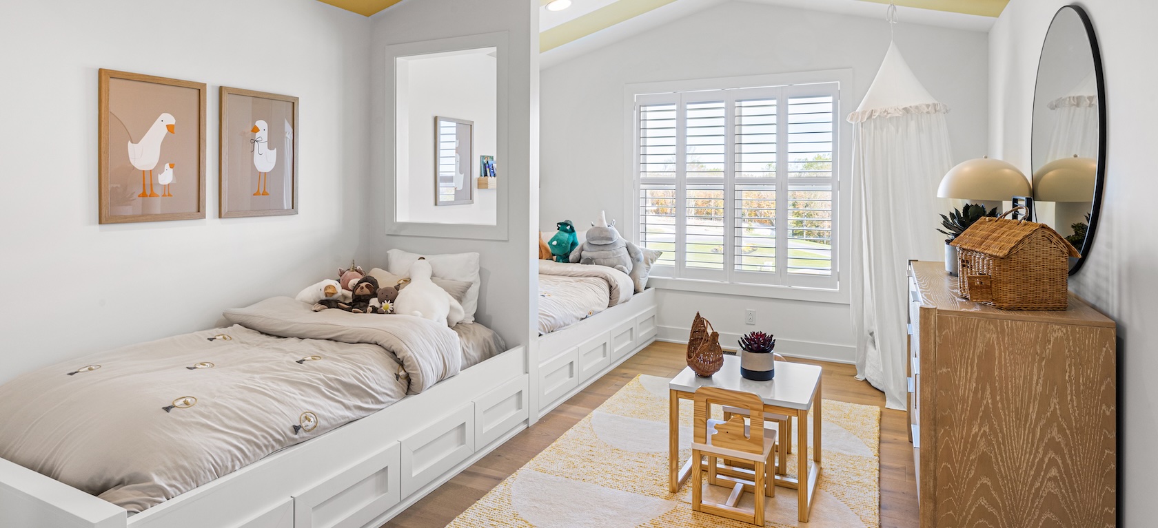 Regardless of how you plan to use the space, storage is a necessity. A built-in wall unit with drawers and open cubbies can double as a dresser, while keeping frequently used items within reach. Adding a kids-height bookcase at the end of each bed keeps reading top of mind. Toy chests are good for concealing all kinds of playthings and can be topped with a cushion for extra seating. Store less-used items under each bed in roll-away containers.