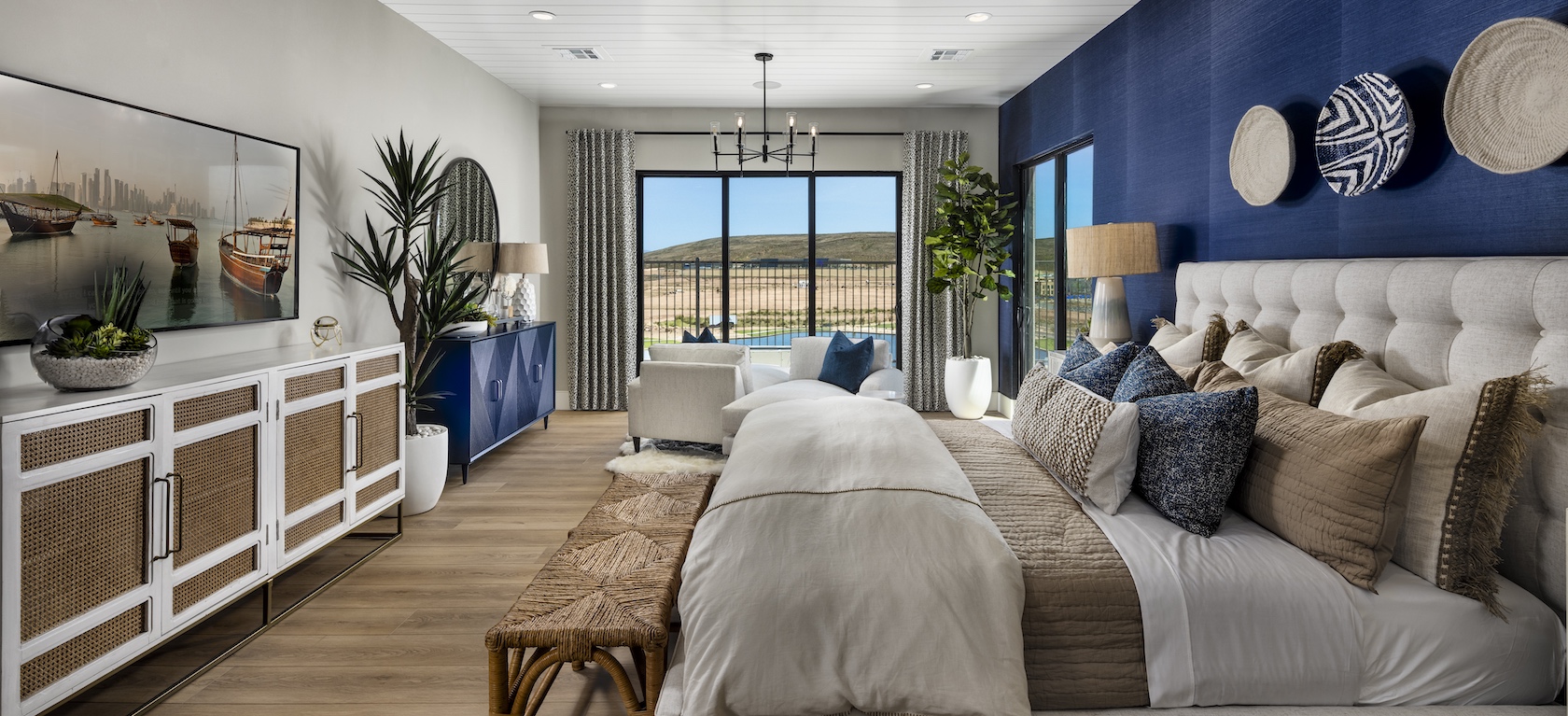 The professionally designed and decorated Paradiso model home is now open for tours. The model home features 3 bedrooms, a flex space, and a 4-car garage. Past the entry courtyard and through the home’s foyer, the great room expands through sliding doors that lead to an outdoor oasis. A top-to-bottom tiled accent wall accentuates the two-story, 20-foot great room ceiling. The large gourmet kitchen with oversized island features an adjacent casual dining area. In addition, the primary bedroom suite features a luxurious bath with impressive shower and large walk-in closet.