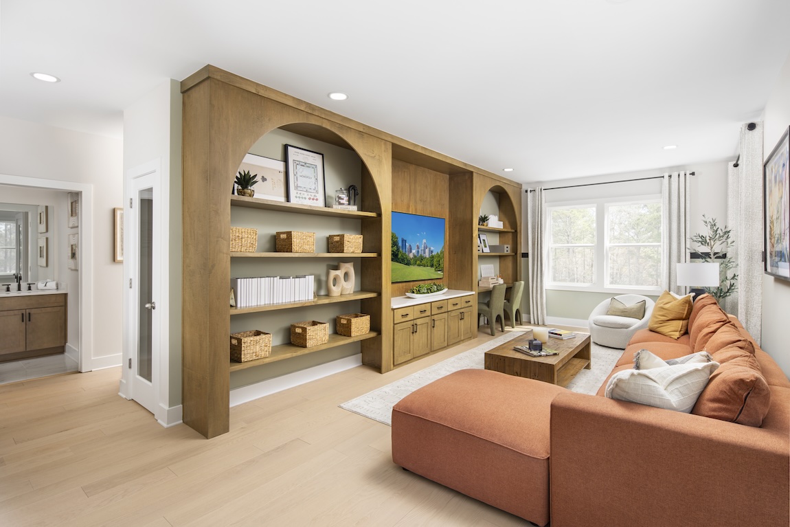 The Rory’s airy foyer is open to the lovely living room and beautiful dining room, and offers alluring views to the expansive great room with gorgeous covered porch beyond.