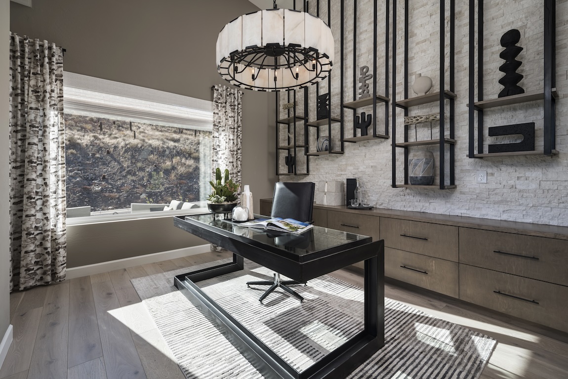 Find inspiration in this home office space which features statement lighting over a sleek and elegant glass table. Whether you’re sitting down with a cup of coffee or working from home, this cohesive design perfectly synchronizes with the tone of the room.