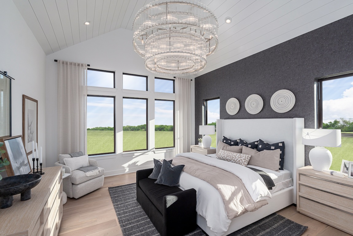 Accentuate your high ceilings or painted trim accents with intricate Glimmer pendants. Build a romantic atmosphere with beautifully elegant accessories, such as in this master suite.