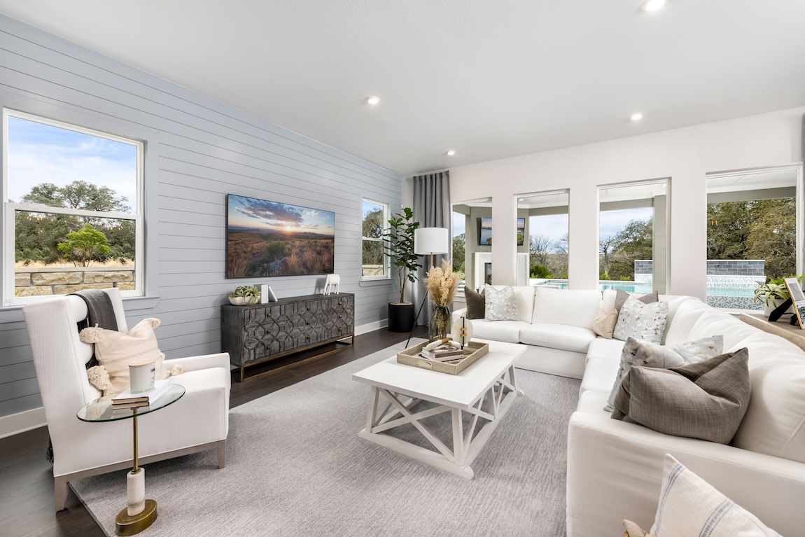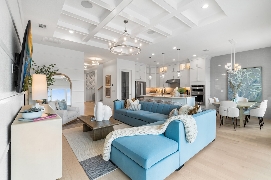 2. Shiplap painted in Upward blue adds a chic touch to a neutral-toned great room.