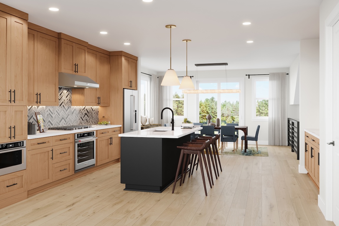 - Cabinetry: Warm wood with a mocha black island