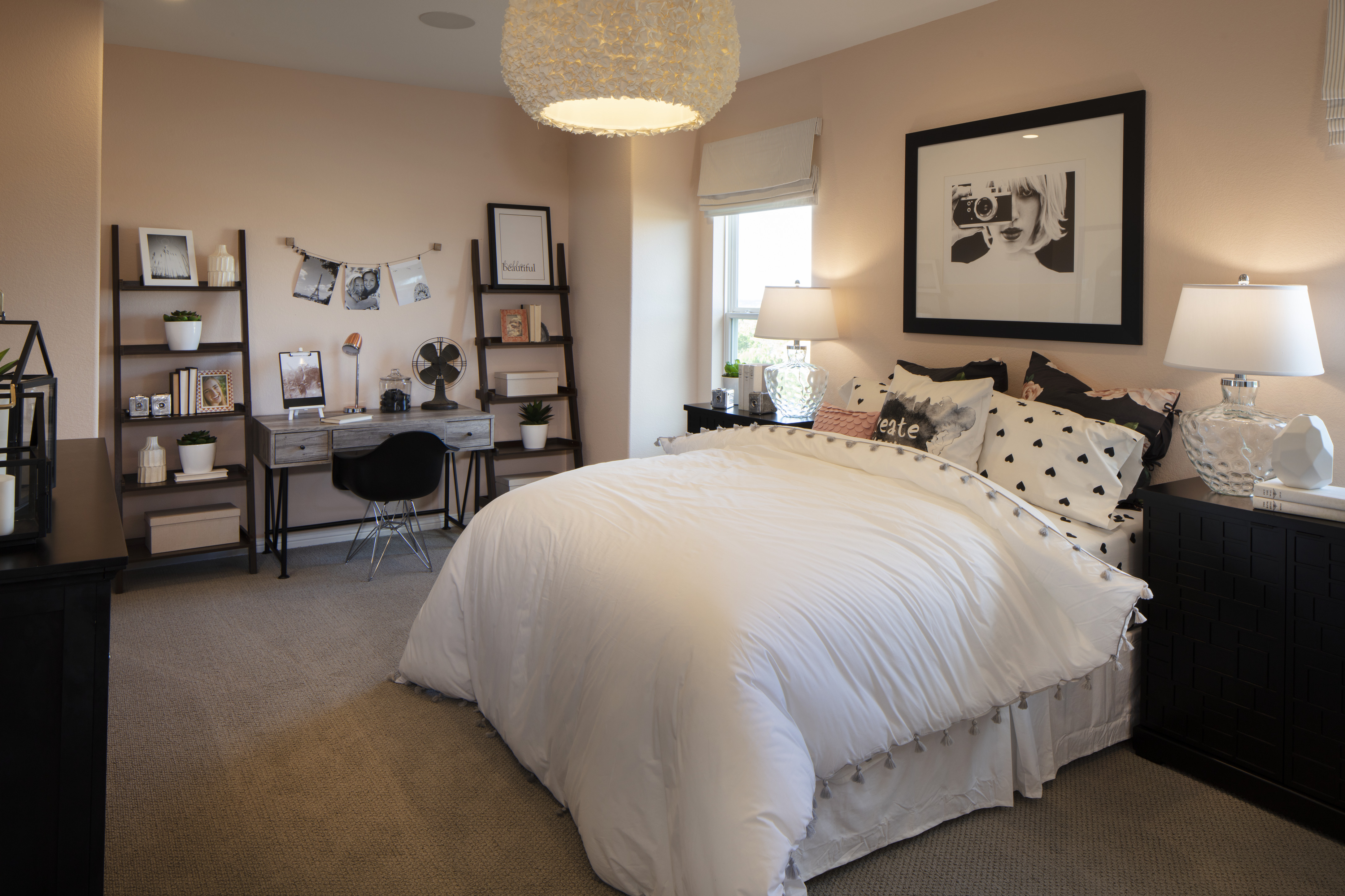 When lighting a teenager’s room, it is important to think about what kind of lighting will best serve their needs. Consider how much your teen studies and watches TV, along with any other activities they like to do in their own space. Add layers of light fixtures that they can adjust to their liking, such as recessed lighting, an eye-catching chandelier, and table lamps. Consider hanging lights on each side of the bed to serve as great bedside lights without taking up space on the nightstand.
