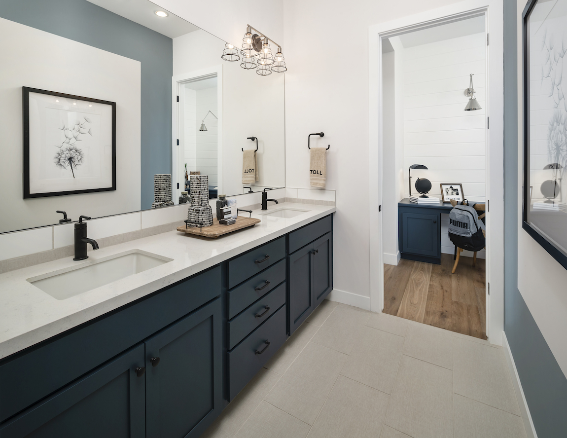 Bathrooms are a surprisingly wonderful place to experiment with how dark color impacts a space. They’re smaller than most rooms, so repainting isn’t as harrowing of a task. While beiges are back on the neutral scene and make for a solid and steady color choice in any room, Naval is fun alternative. This beautiful hue can transform a bath into an oasis and acts as a bold, yet neutral backdrop for a variety of tastes and finishes.