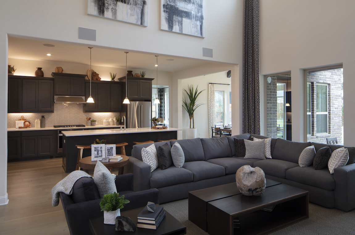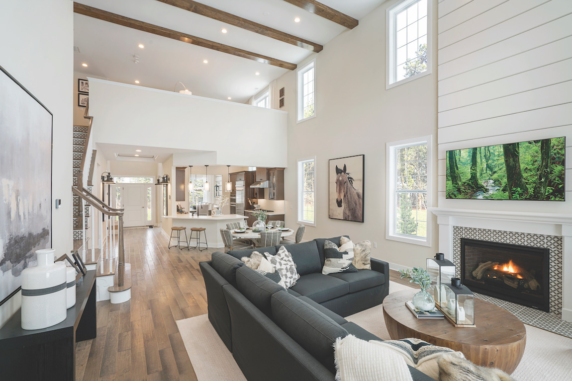 The Hayden’s bright and open great room boasts a double volume ceiling and a dramatic window display.