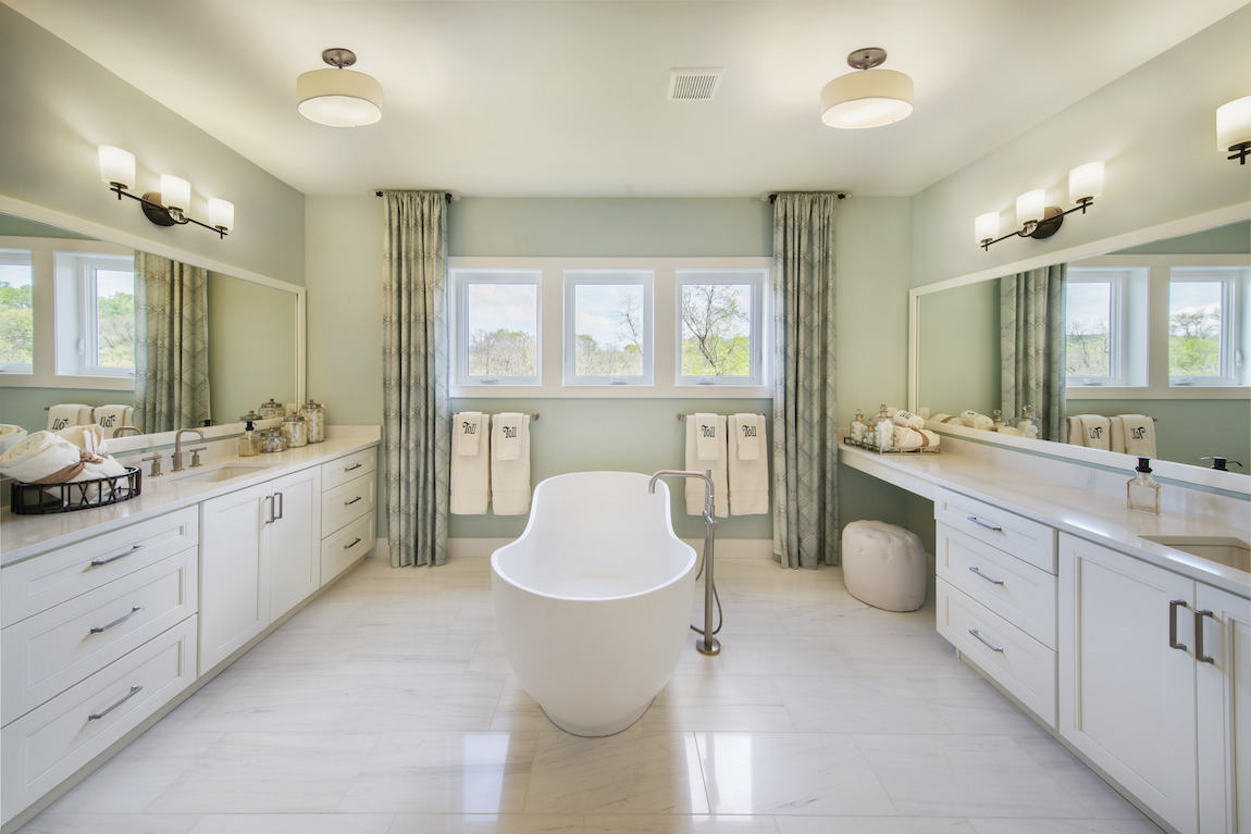 The Shiloh’s third floor features the primary bedroom complete with an elegant Juliet balcony, dual walk-in closets, and deluxe primary bath with a dual-sink vanity, large soaking tub, and a luxe glass-enclosed shower with a seat.