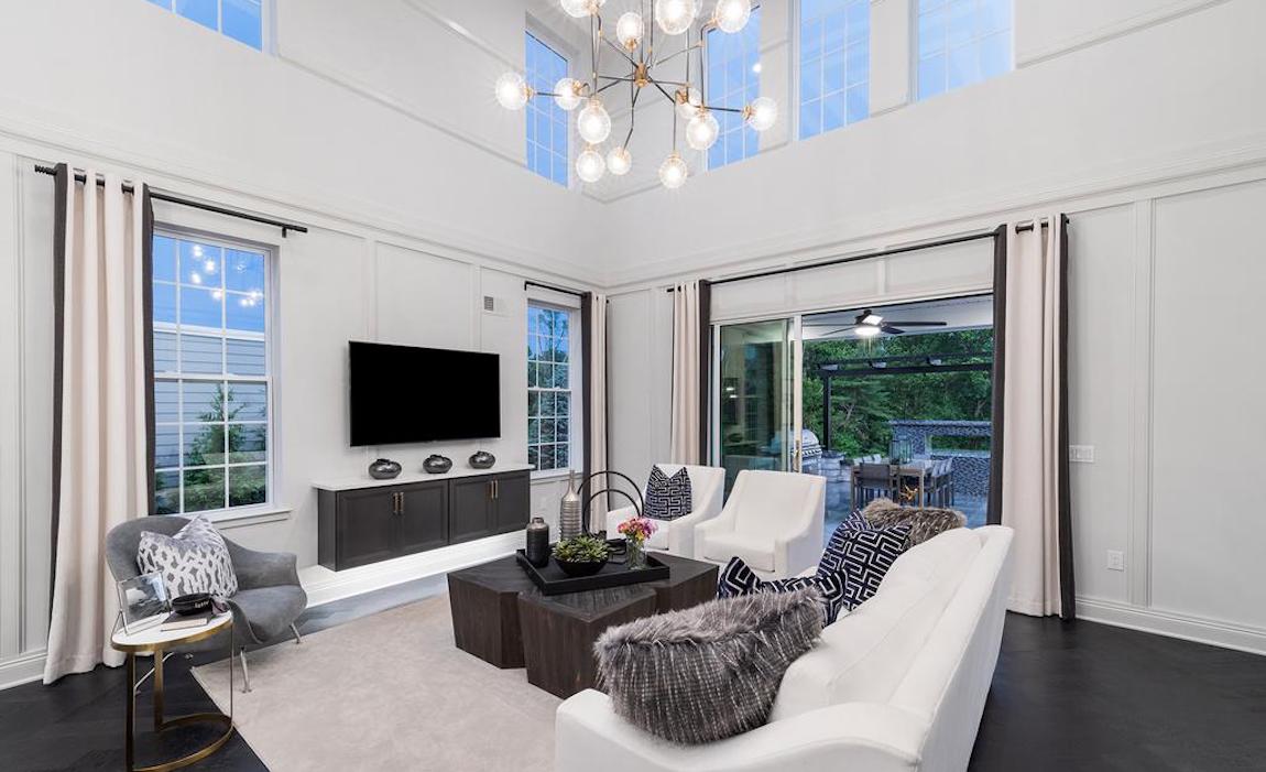 A grand array of two-story windows wraps around the family room of the dramatic Valmont for beautiful views of the outdoors.
