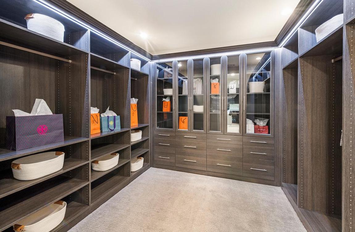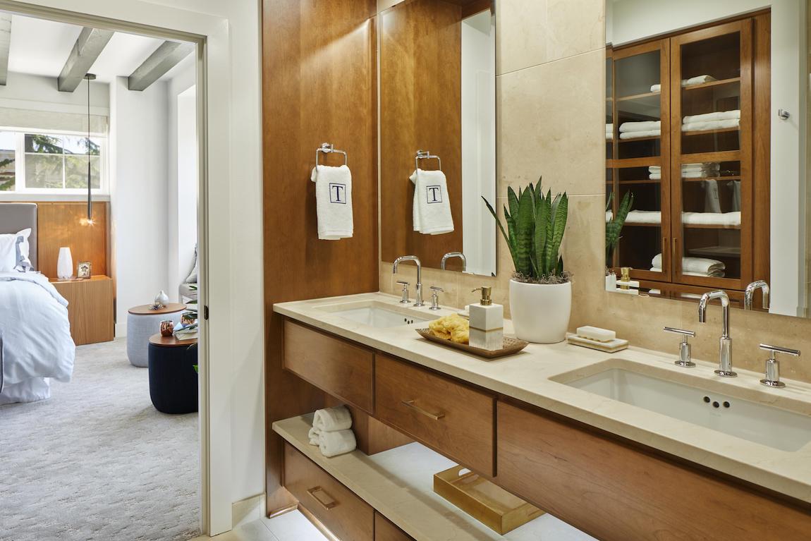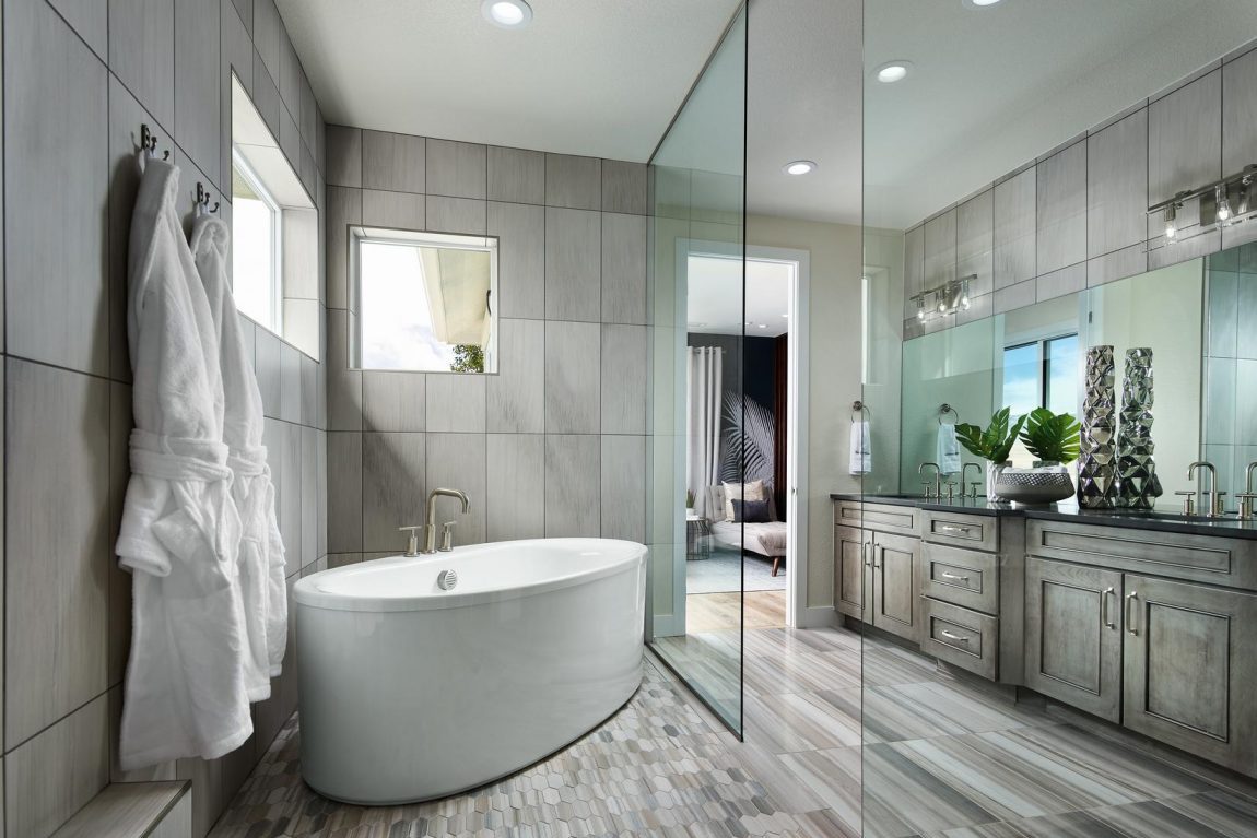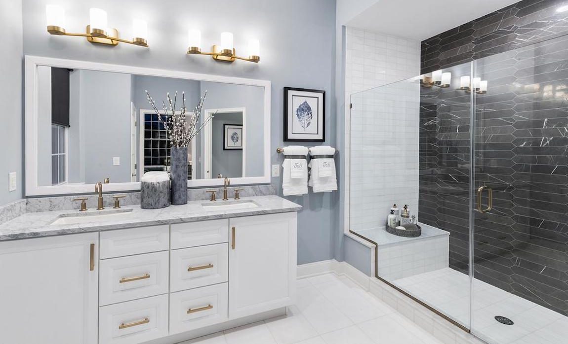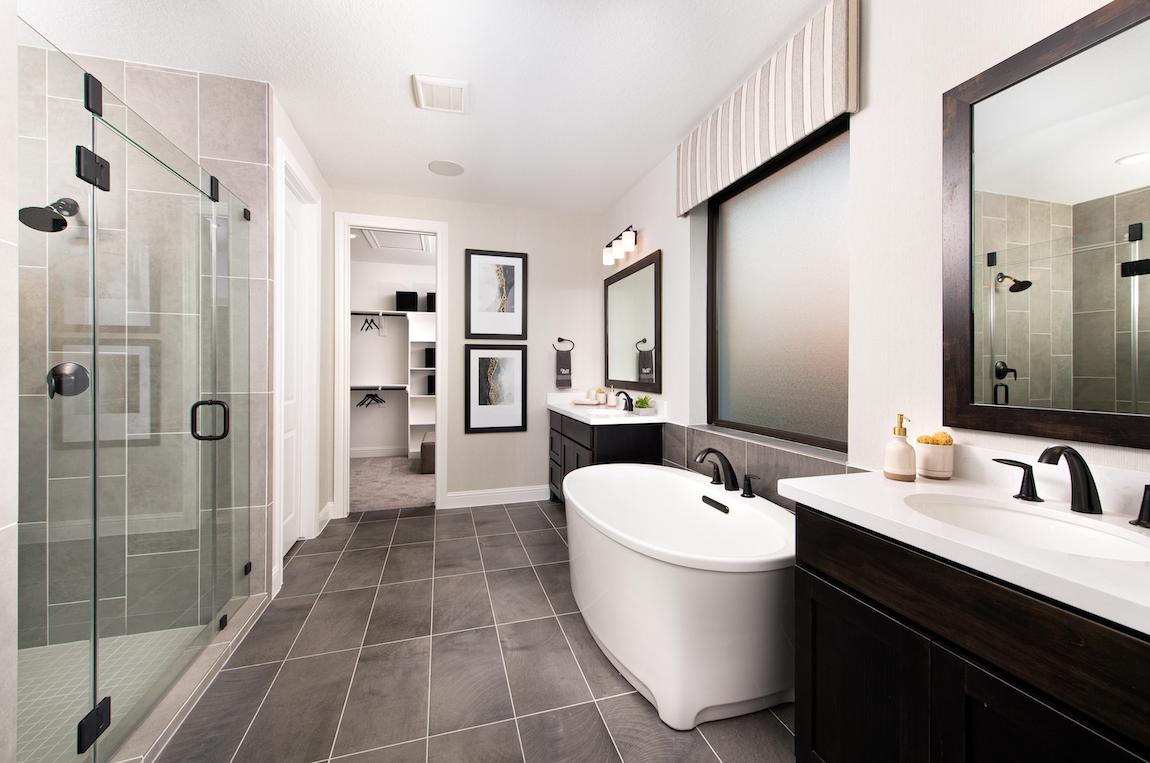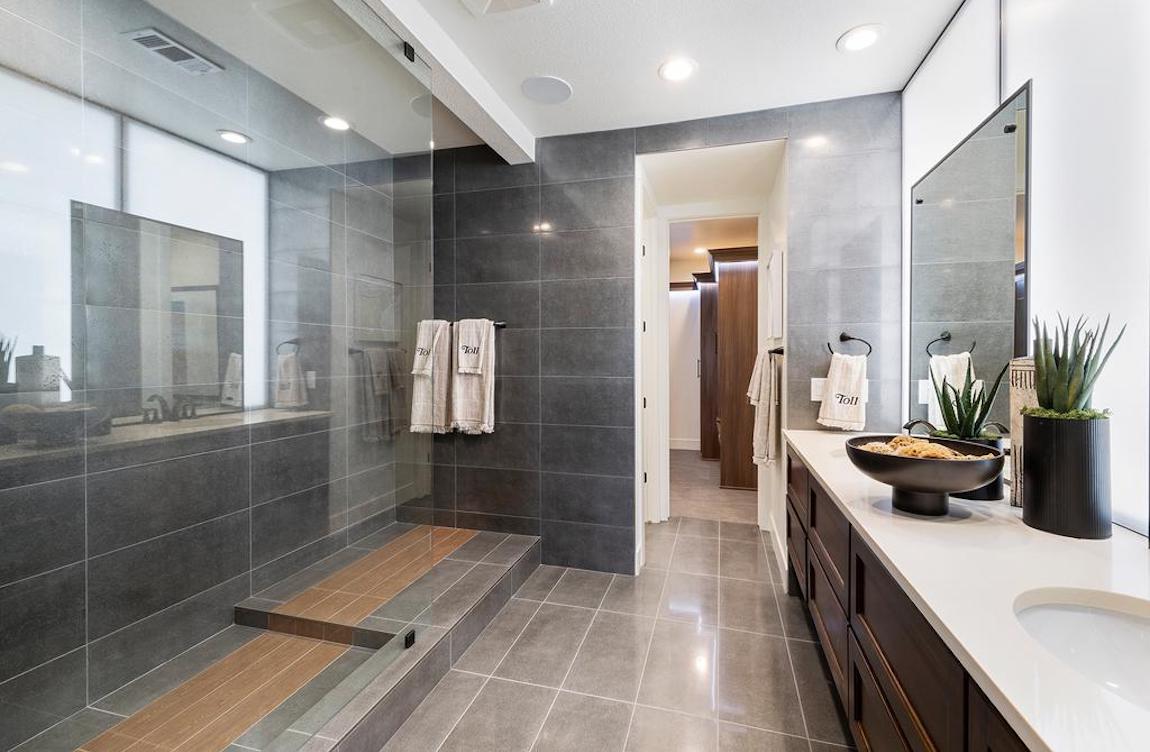 The Crawford’s gorgeous primary bedroom is highlighted by a gigantic walk-in closet and spa-like primary bath with dual-sink vanity, large luxe glass-enclosed shower with seat, linen storage, and private water closet.