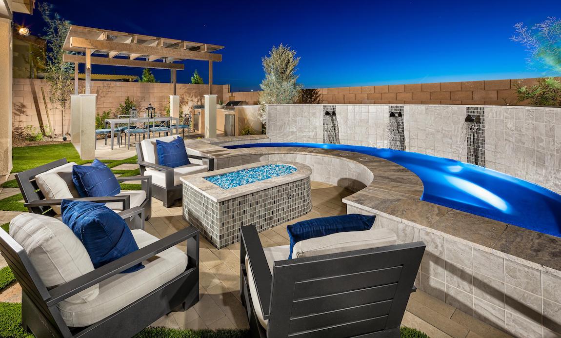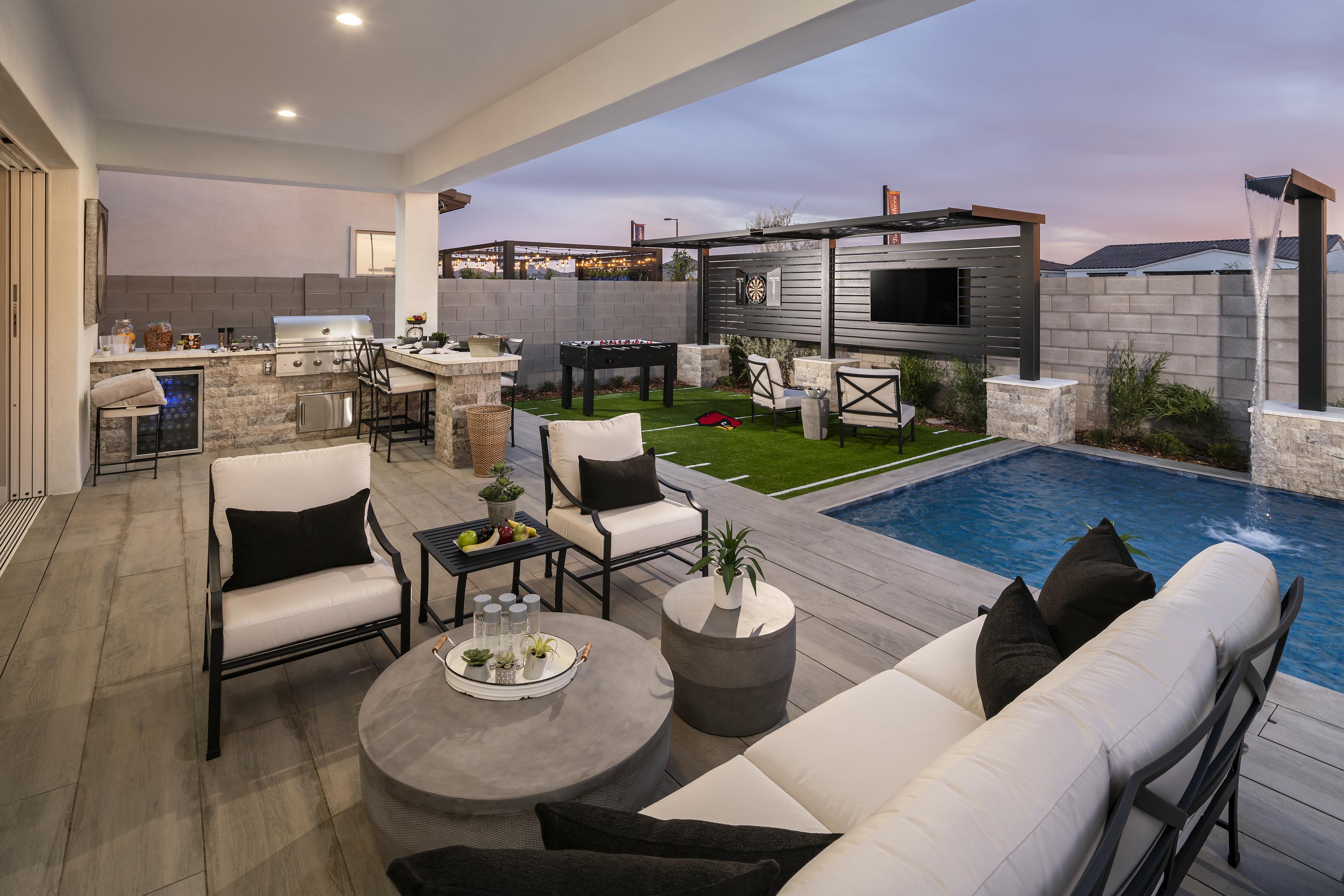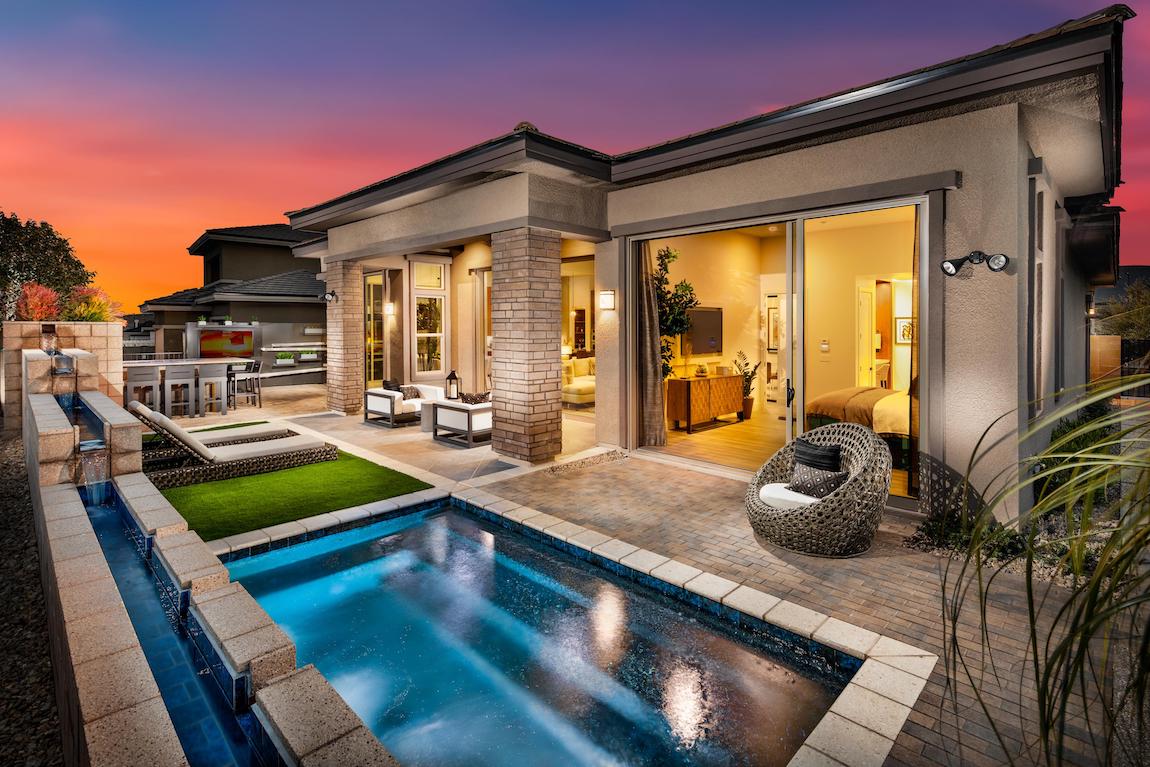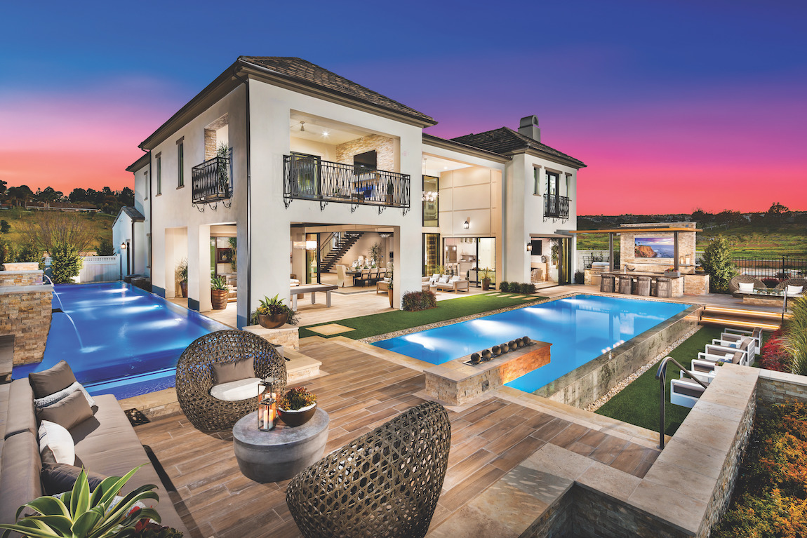 Deluxe family living. The Olgiata’s inviting covered entry flows into an impressive two-story foyer with dual staircases, affording views of the two-story dining room, great room, and desirable wraparound luxury outdoor living space beyond.