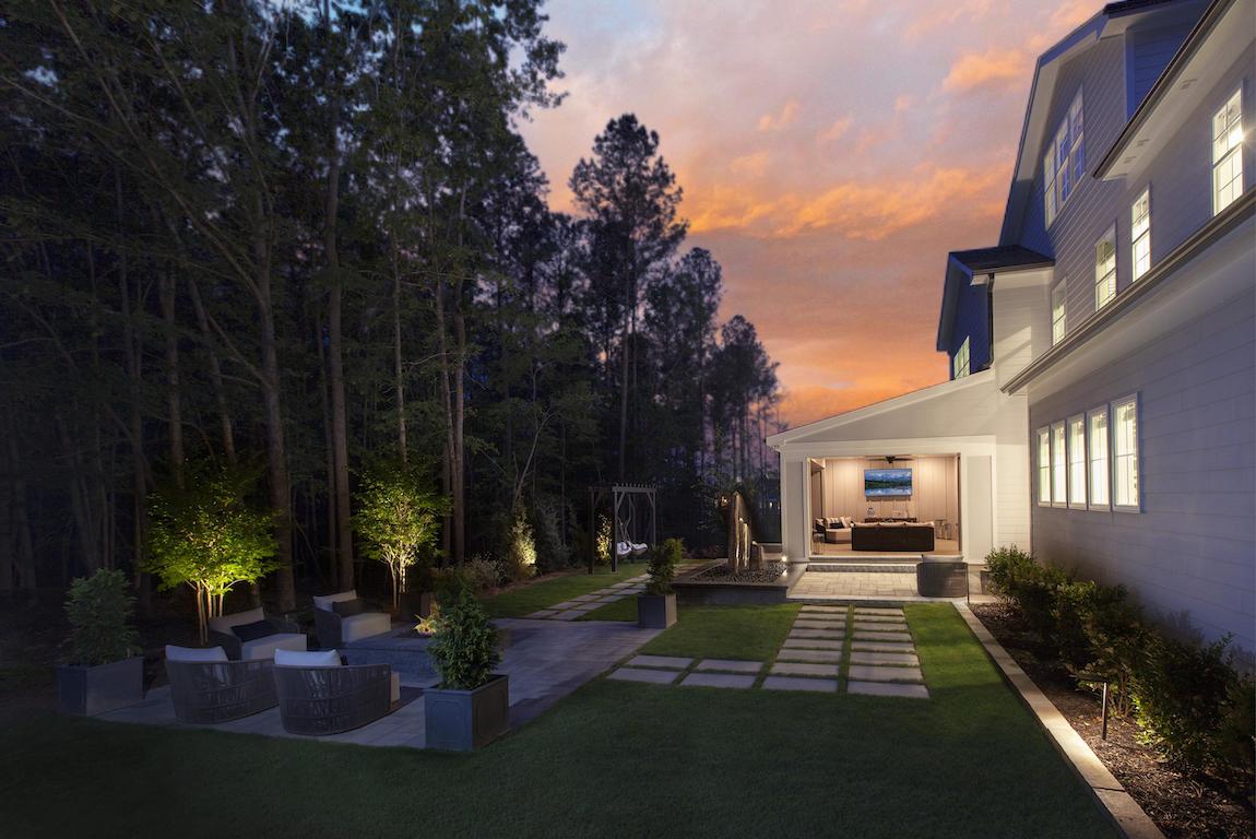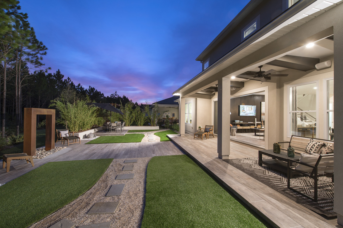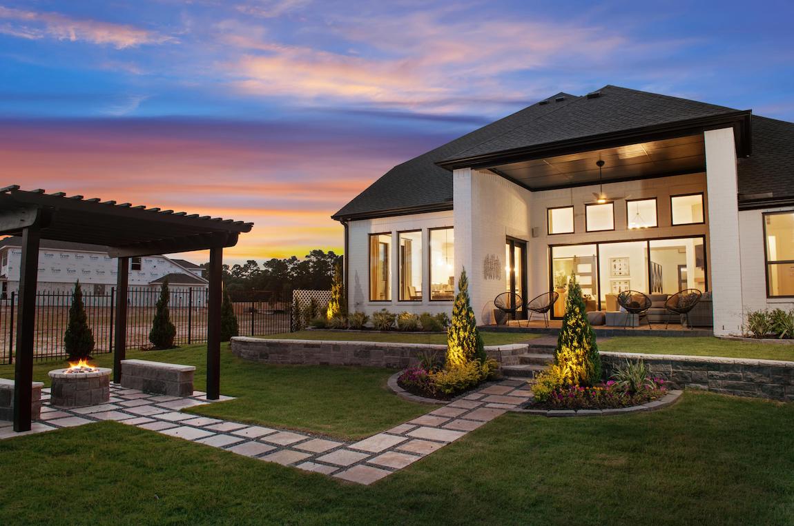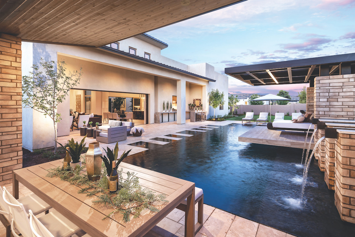 Deluxe family lifestyle. The Evans’ inviting covered entry with stepped landing reveals the welcoming foyer and views of the soaring great room, dining room, and desirable wraparound luxury outdoor living space beyond.