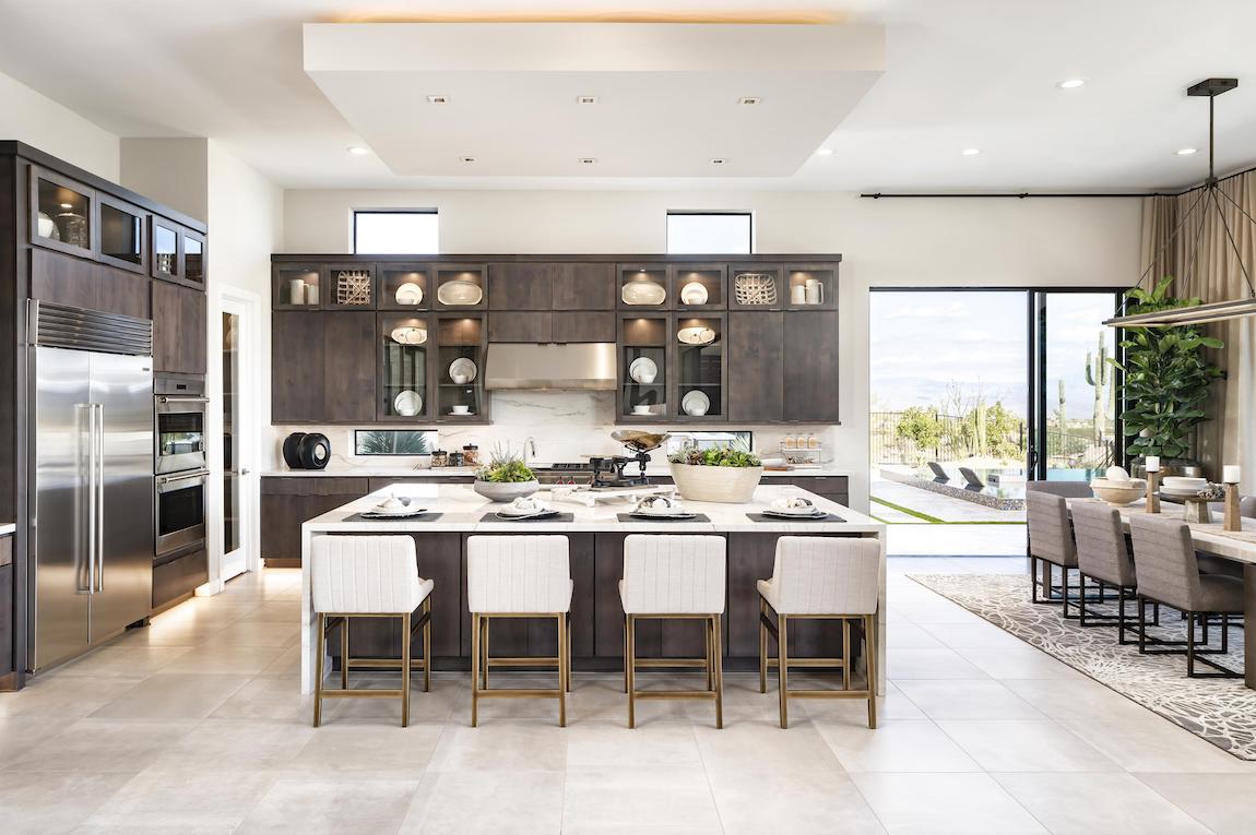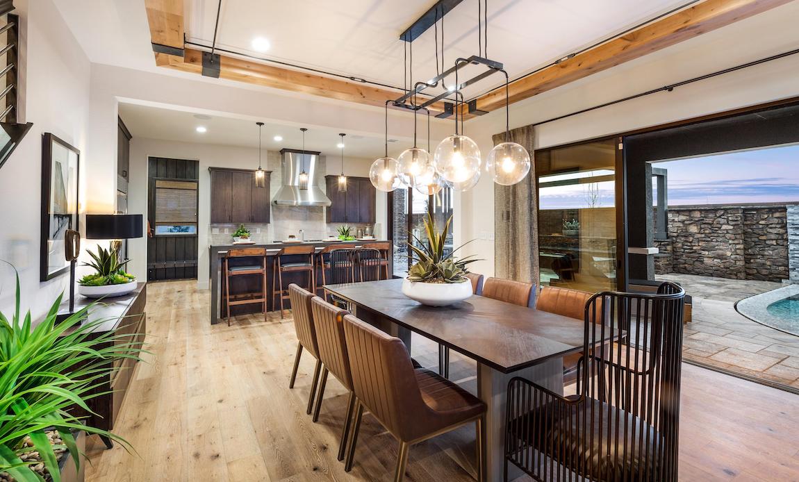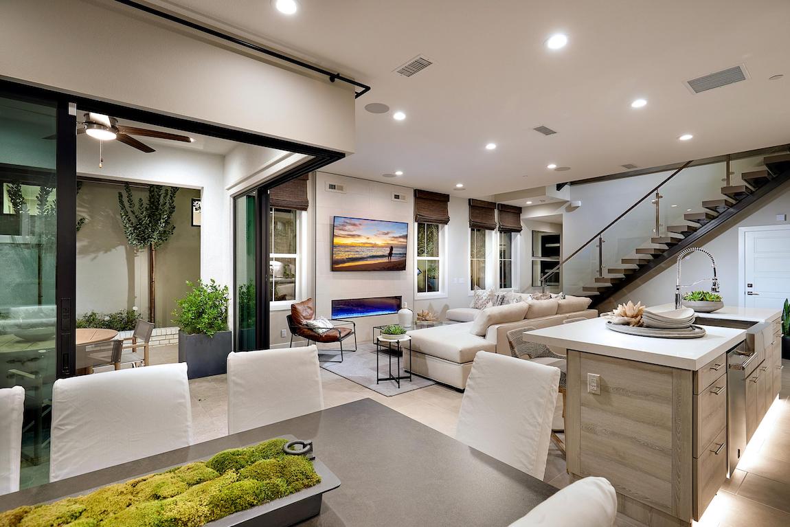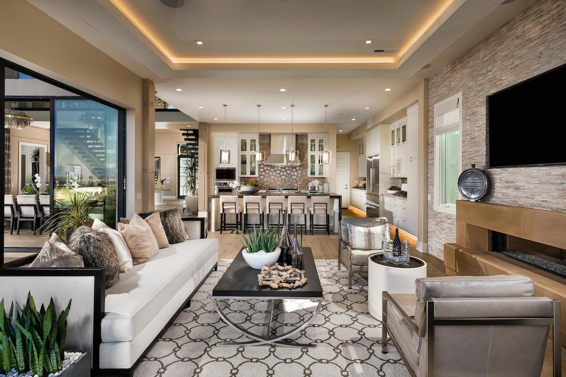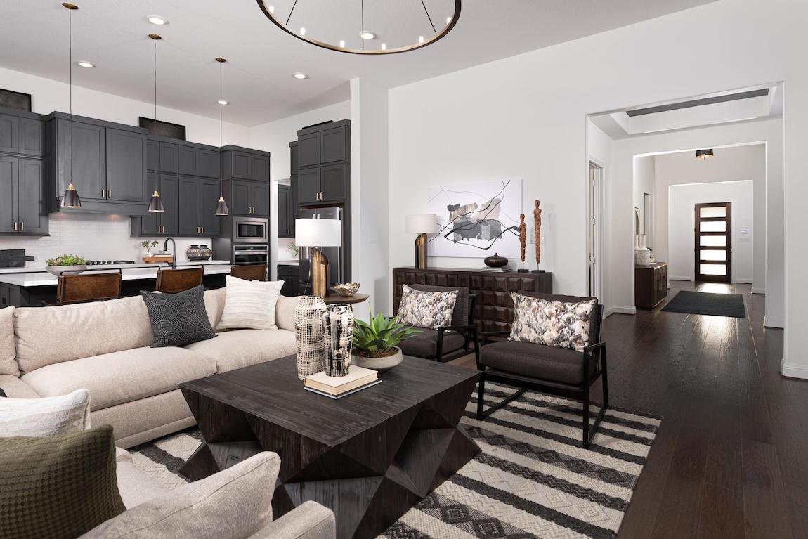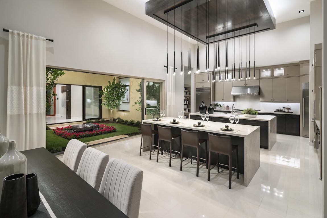 Luxe urban design. The Vera Cruz Elite’s inviting covered entry and foyer flow into the soaring great room, with views of the bright casual dining area and desirable luxury outdoor living space.