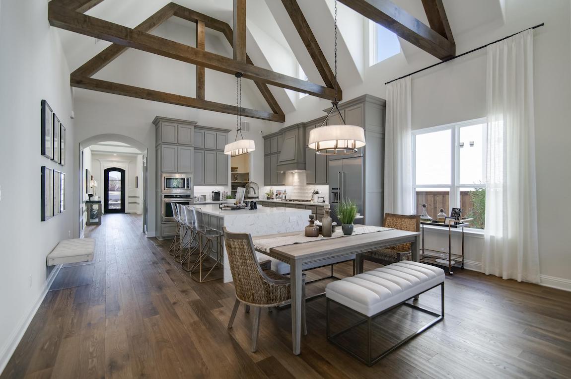 A beautiful cathedral ceiling unifies the main living areas of the stunning Rochester creating dramatic impact in this home.