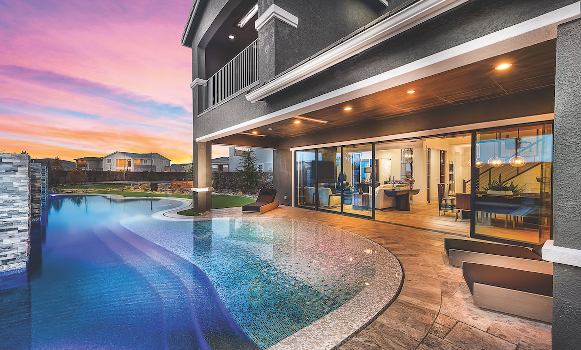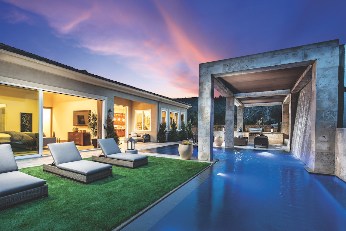 Elegant design and lifestyle. The Fairway’s inviting entry and two-story foyer open to a spacious office, and views of the soaring two-story great room and desirable two-story outdoor luxury living space beyond, accessible through an elaborate glass sliding door system.