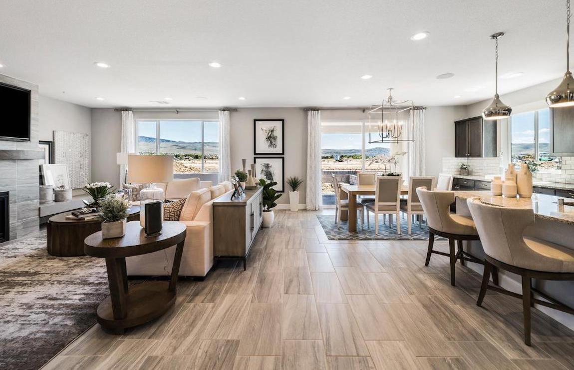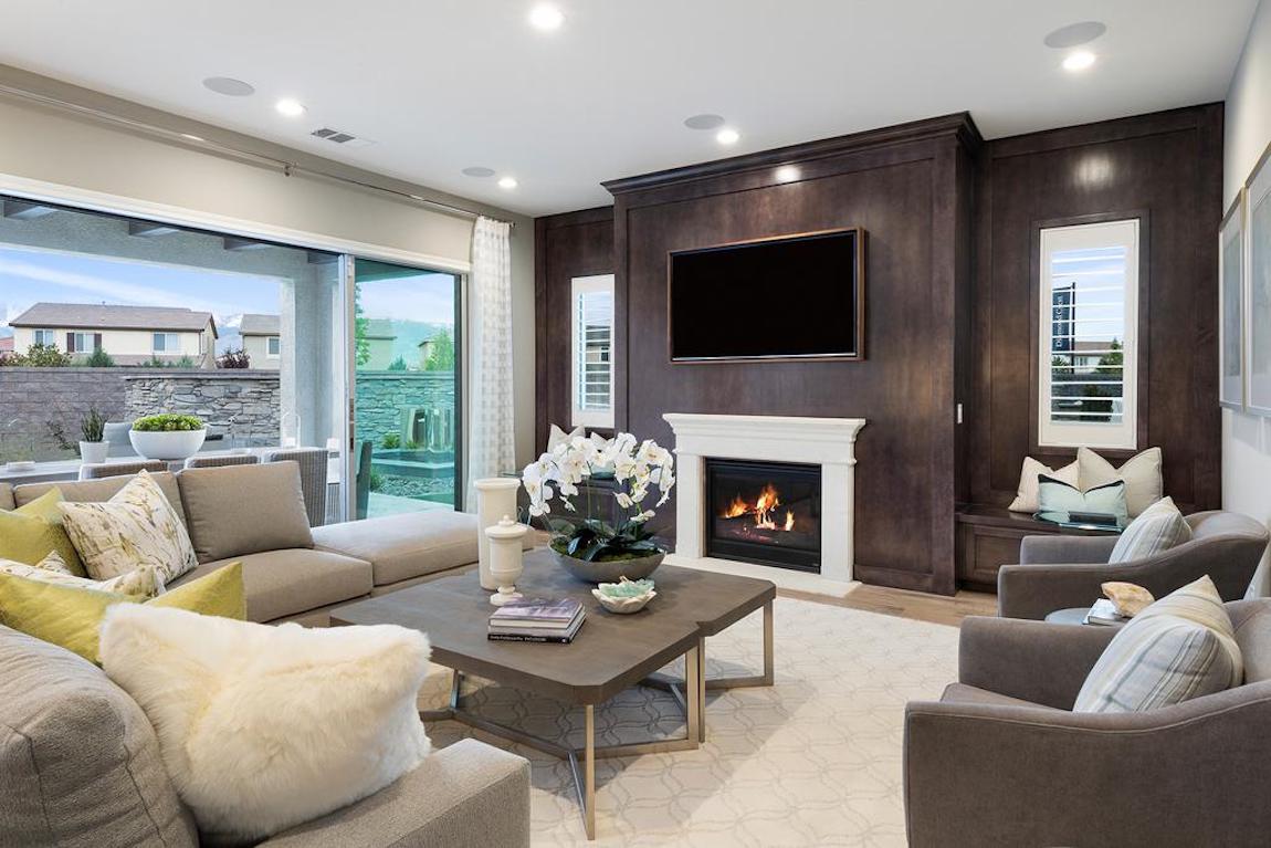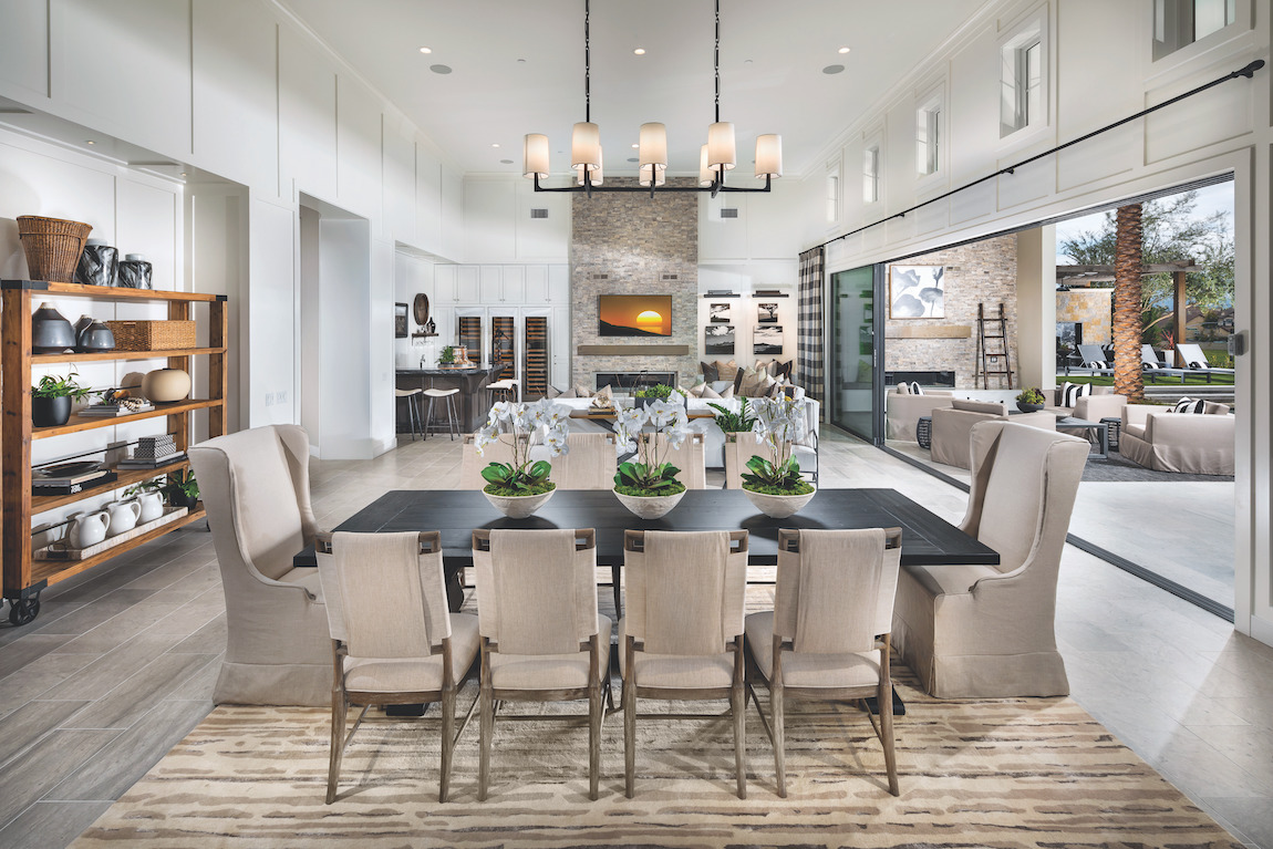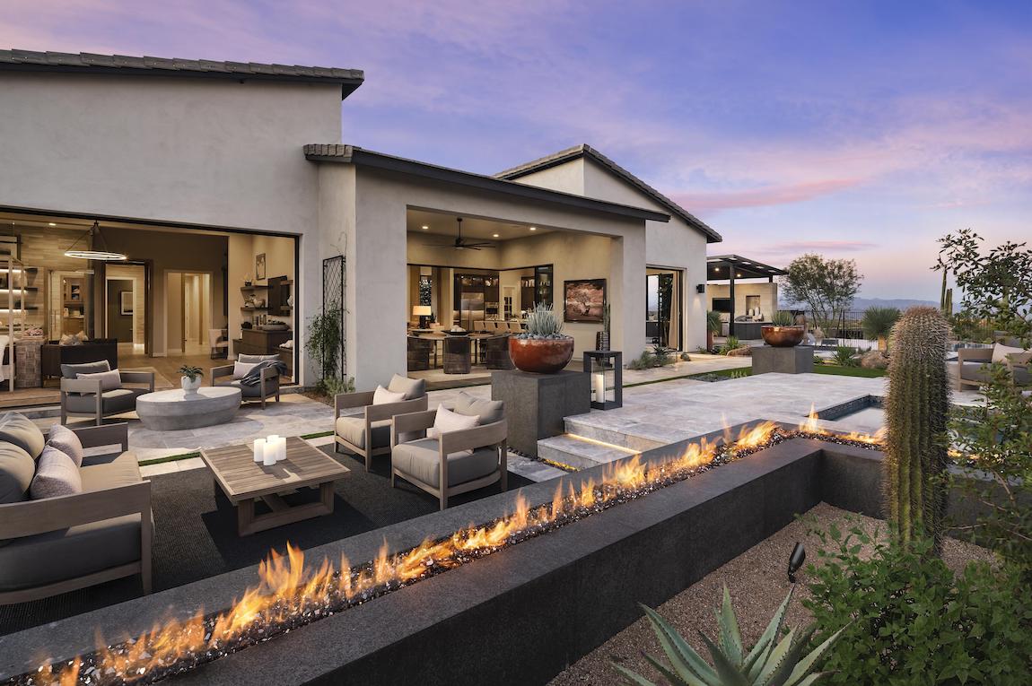 The Crestone’s enormous, bright windows provide natural light to the captivating great room, which features a magnificent fireplace and views straight through to the spacious rear covered patio.