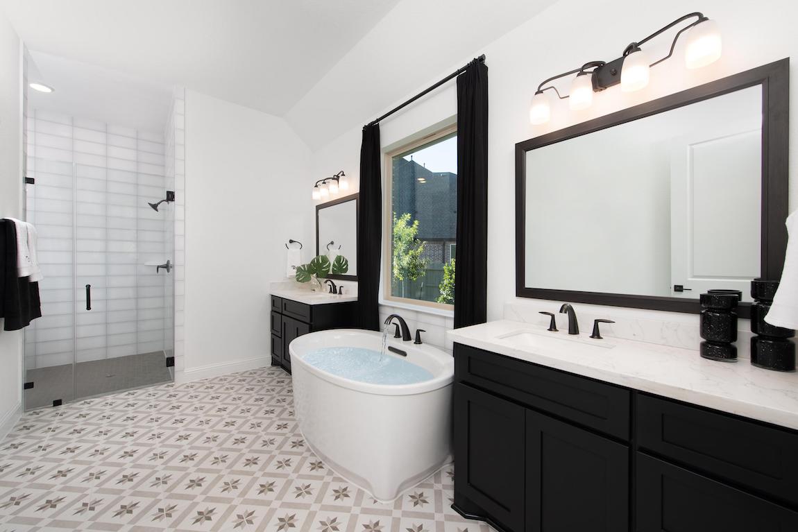 The spacious primary bedroom offers a generous walk-in closet and gorgeous primary bath complete with dual vanities, large soaking tub, luxe shower with seat, and private water closet.