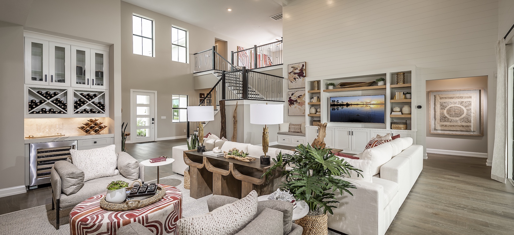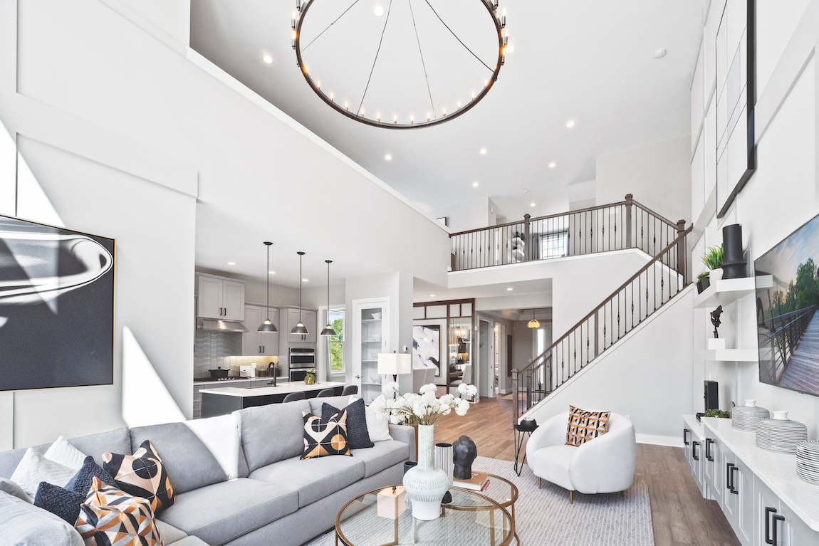 When situated in an open concept layout, a two-story great room helps facilitate an ambiance that feels calm, connected, and balanced throughout the home.