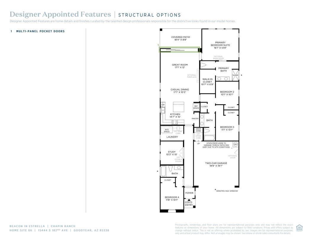 Impressive urban appointments. The Chapin's inviting covered entry and welcoming foyer hallway flow into the expansive great room, casual dining area, and desirable covered patio beyond. The well-designed gourmet kitchen is highlighted by a large center island with breakfast bar, plenty of counter and cabinet space, and generous pantry. The gracious primary bedroom suite is complete with an enormous walk-in closet and spa-like primary bath with dual-sink vanity, large luxe shower, and private water closet. Secondary bedrooms feature roomy closets and access to two shared hall baths, one with separate dual-sink vanity area. Additional highlights include a desirable office off the foyer, and centrally located laundry.