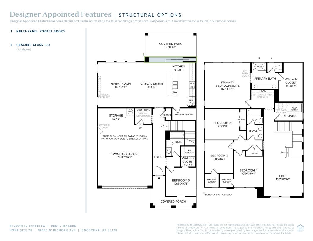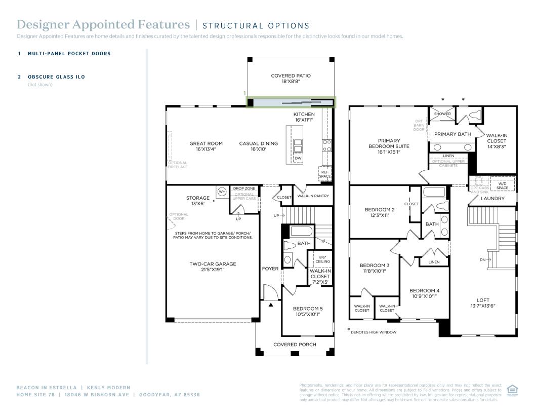 Modern family deluxe. The Kenly's welcoming extended covered porch and inviting foyer hallway flow right into the spacious great room and bright casual dining area, with views to the desirable covered patio beyond. The well-designed gourmet kitchen is equipped with a large center island with breakfast bar, plenty of counter and cabinet space, and ample walk-in pantry. The superb primary bedroom suite is complete with a king-size walk-in closet and spa-like primary bath with dual-sink vanity, large luxe shower, and private water closet. Central to a generous loft, secondary bedrooms feature sizable closets and shared hall bath with separate dual-sink vanity area. Additional highlights include a versatile office, convenient powder room, centrally located laundry, and additional storage.