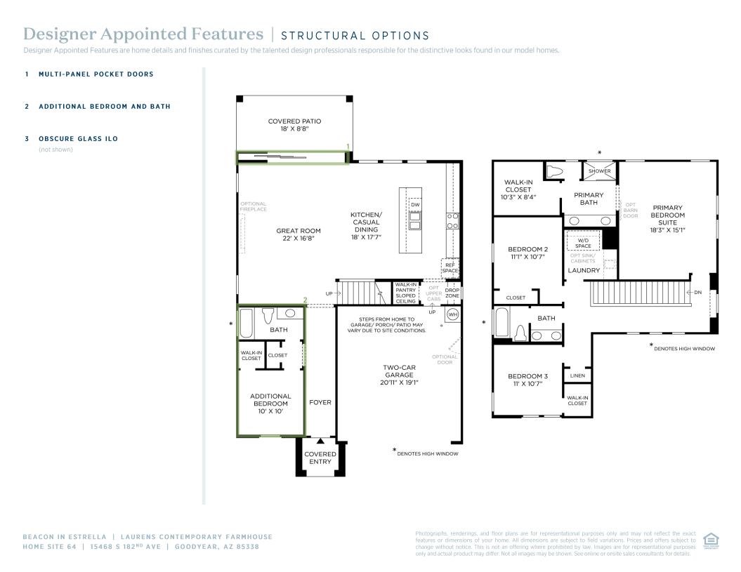 Well-designed family style. The Laurens' inviting covered entry and welcoming foyer flow past a bright office to views of the spacious great room, casual dining area, and desirable covered patio beyond. The well-equipped gourmet kitchen is highlighted by a large center island with breakfast bar, plenty of counter and cabinet space, and roomy walk-in pantry. The serene primary bedroom suite is enhanced by a sizable walk-in closet and spa-like primary bath with dual-sink vanity, large luxe shower, and private water closet. Generous secondary bedrooms feature ample closets and shared hall bath with separate dual-sink vanity area. Additional highlights include a convenient powder room, centrally located laundry, and additional storage.