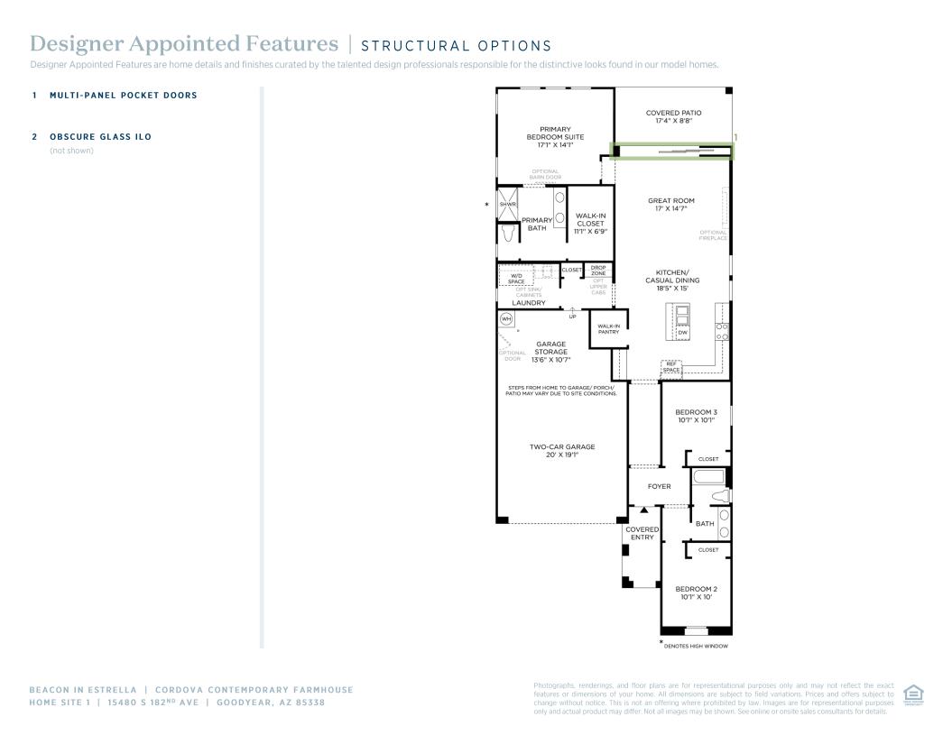 The Cordova's welcoming covered entry and inviting foyer reveal views to the spacious great room, casual dining area, and desirable covered patio beyond. The well-equipped gourmet kitchen is enhanced by a large center island with breakfast bar, plenty of counter and cabinet space, and sizable walk-in pantry. The secluded primary bedroom suite is highlighted by a generous walk-in closet and spa-like primary bath with dual-sink vanity, large luxe shower, and private water closet. Ample secondary bedrooms feature roomy closets and shared hall bath with separate dual-sink vanity area. Additional highlights include centrally located laundry and additional storage.