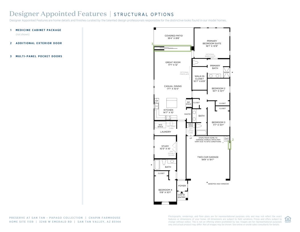Impressive urban appointments. The Chapin's inviting covered entry and welcoming foyer hallway flow into the expansive great room, casual dining area, and desirable covered patio beyond. The well-designed gourmet kitchen is highlighted by a large center island with breakfast bar, plenty of counter and cabinet space, and generous pantry. The gracious primary bedroom suite is complete with an enormous walk-in closet and spa-like primary bath with dual-sink vanity, large luxe shower, and private water closet. Secondary bedrooms feature roomy closets and access to two shared hall baths, one with separate dual-sink vanity area. Additional highlights include a desirable office off the foyer, and centrally located laundry.
