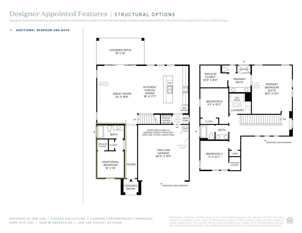 Well-designed family style. The Laurens' inviting covered entry and welcoming foyer flow past a bright office to views of the spacious great room, casual dining area, and desirable covered patio beyond. The well-equipped gourmet kitchen is highlighted by a large center island with breakfast bar, plenty of counter and cabinet space, and roomy walk-in pantry. The serene primary bedroom suite is enhanced by a sizable walk-in closet and spa-like primary bath with dual-sink vanity, large luxe shower, and private water closet. Generous secondary bedrooms feature ample closets and shared hall bath with separate dual-sink vanity area. Additional highlights include a convenient powder room, centrally located laundry, and additional storage.