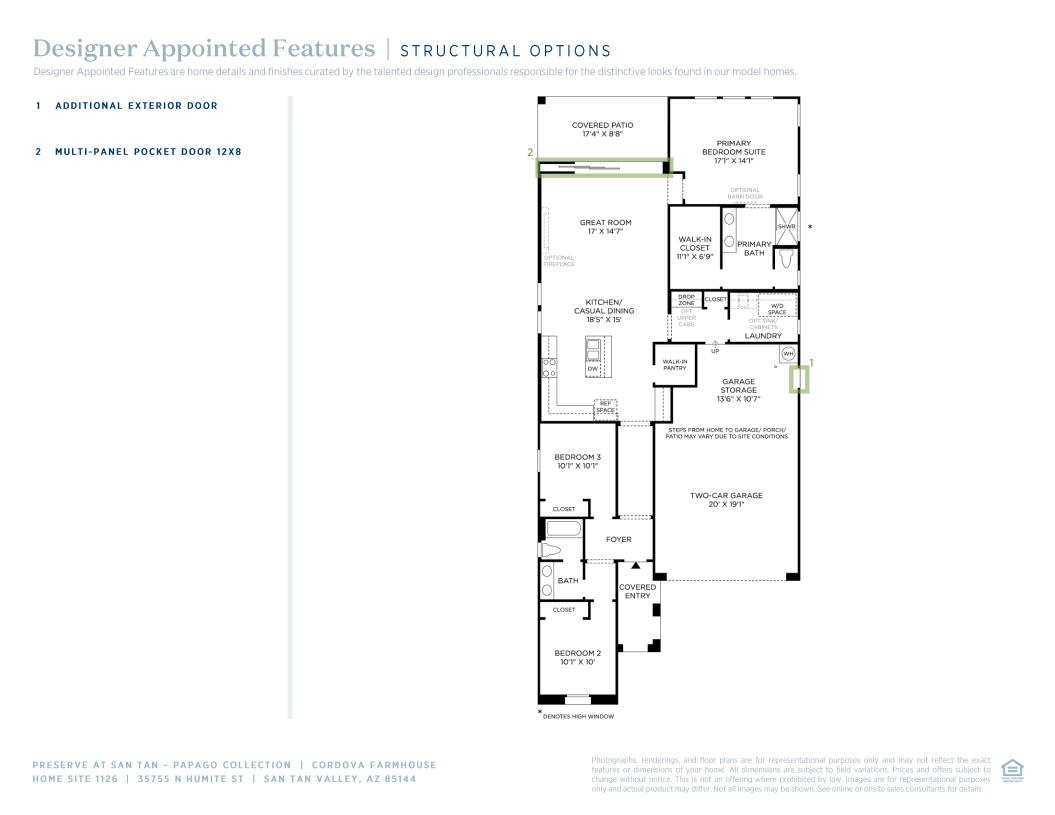 The Cordova's welcoming covered entry and inviting foyer reveal views to the spacious great room, casual dining area, and desirable covered patio beyond. The well-equipped gourmet kitchen is enhanced by a large center island with breakfast bar, plenty of counter and cabinet space, and sizable walk-in pantry. The secluded primary bedroom suite is highlighted by a generous walk-in closet and spa-like primary bath with dual-sink vanity, large luxe shower, and private water closet. Ample secondary bedrooms feature roomy closets and shared hall bath with separate dual-sink vanity area. Additional highlights include centrally located laundry and additional storage.