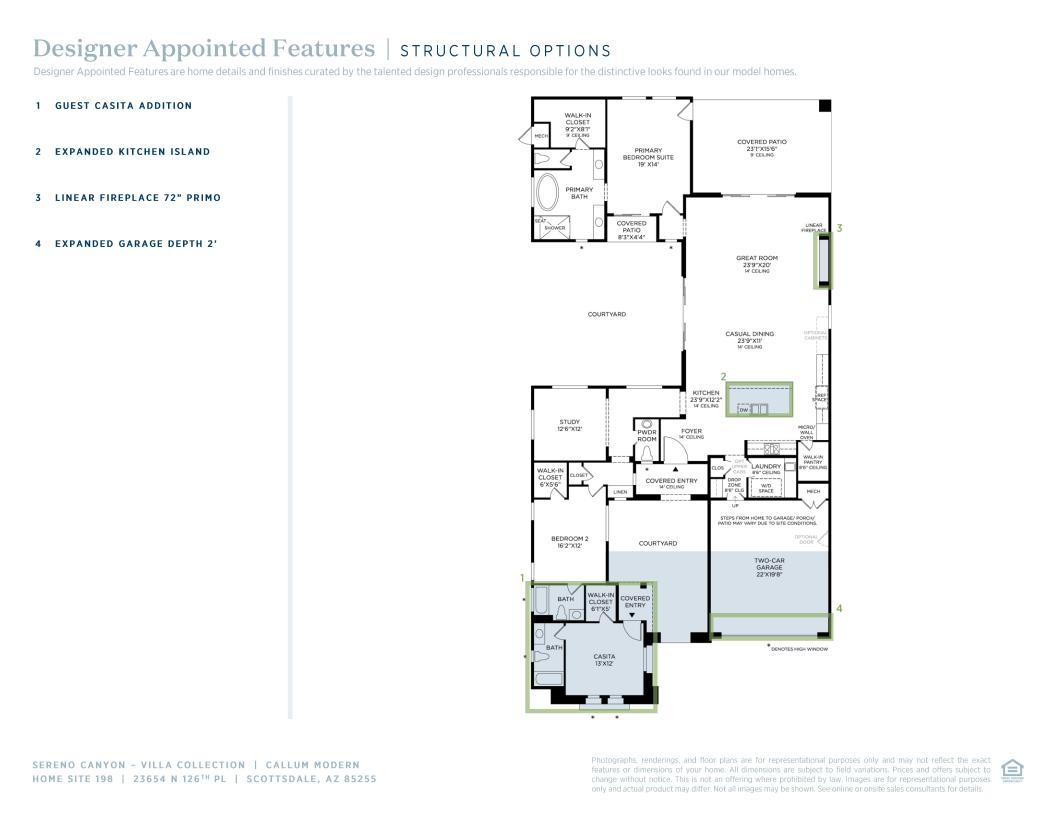 Stunning living style. The Callum's impressive front courtyard and covered entry flow into the welcoming foyer, affording views to the expansive great room, casual dining area, and desirable large covered patio beyond. The well-equipped gourmet kitchen is complete with a large center island with breakfast bar, plenty of counter and cabinet space, and generous walk-in pantry. The secluded primary bedroom suite is enhanced by a private covered patio, spacious walk-in closet, and deluxe primary bath with dual-sink vanity, large soaking tub, luxe shower with seat, and private water closet. The secondary bedroom features a walk-in closet and private full bath with separate vanity area. Additional highlights include a private office, convenient powder room and drop zone, centrally located laundry, and additional storage.