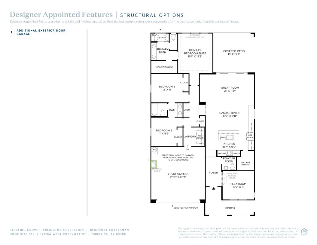 A spacious casual dining area and a great room with access to a beautiful covered patio are revealed from the Bluemont's charming foyer. The well-designed kitchen is enhanced by an oversized center island with breakfast bar, plenty of counter and cabinet space, and a roomy walk-in pantry. The stunning primary bedroom suite is highlighted by a generous walk-in closet and a relaxing primary bath with a dual-sink vanity, a large luxe shower with seat, and a private water closet. Secondary bedrooms feature ample closets and a shared bath with a separate dual-sink vanity area. Additional highlights include a sizable flex room, a powder room off the foyer, conveniently located laundry, and plenty of additional storage.