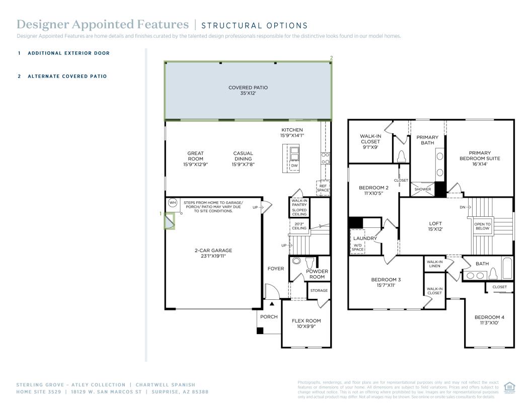 The Chartwell home design offers a blend of comfort and elegance with a thoughtful, open floor plan. The first floor features a spacious great room that connects to a casual dining area and a well-appointed kitchen, complete with a center island and walk-in pantry, ideal for entertaining and everyday living. Just off the kitchen, a covered patio extends the living space outdoors for fresh-air dining. A versatile flex room and nearby powder room provide added functionality and convenience. Upstairs, a cozy loft adds additional living space, while the private primary suite impresses with a large walk-in closet and a spa-inspired bath with a dual-sink vanity, a luxurious shower, and a private water closet. Three secondary bedrooms, including one with a walk-in closet, share a full hall bath. A centrally located laundry room on the second floor and ample storage throughout the home complete this exceptional design.